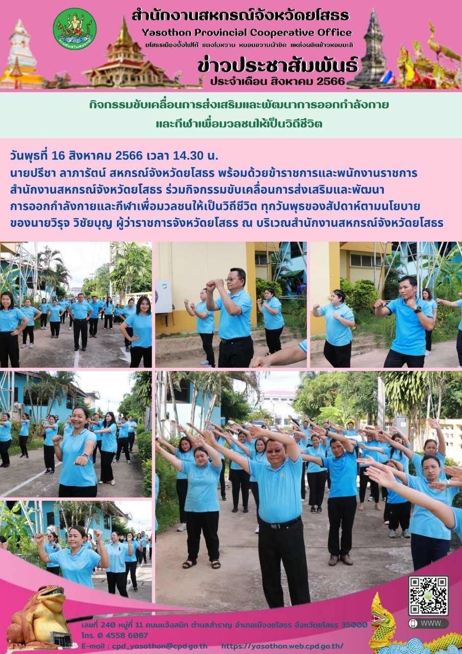 นายปรีชา ลาภารัตน์ สหกรณ์จังหวัดยโสธรพร้อมด้วยเจ้าหน้าที่สำนักงานสหกรณ์จังหวัดยโสธร ร่วมกิจกรรมขับเคลื่อนการส่งเสริมและพัฒนาการออกกำลังกายและกีฬาเพื่อมวลชนเป็นวิถีชีวิต ทุกวันพุธของสัปดาห์ตามนโยบายผู้ว่าราชการจังหวัดยโสธร ณ บริเวณสำนักงานสหกรณ์จังห