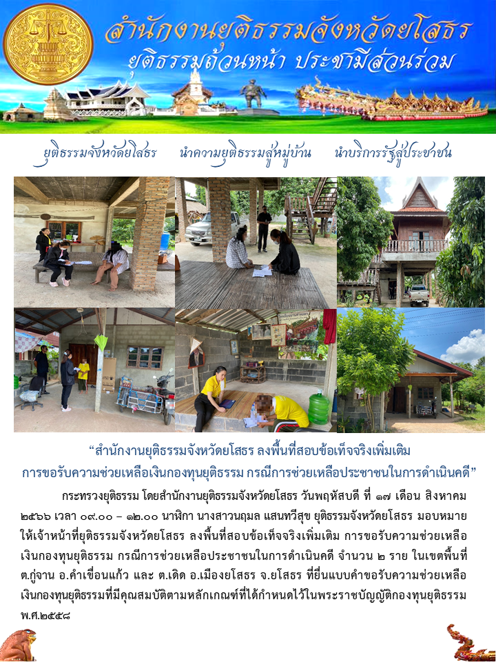 17 สิงหาคม 2566 สำนักงานยุติธรรมจังหวัดยโสธร ลงพื้นที่สอบข้อเท็จจริงเพิ่มเติม การขอรับความช่วยเหลือเงินกองทุนยุติธรรม กรณีการช่วยเหลือประชาชนในการดำเนินคดี