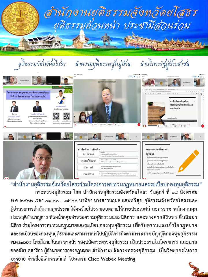 วันที่ 18 ส.ค. 2566 (14:08 น.)กระทรวงยุติธรรม โดย สำนักงานยุติธรรมจังหวัดยโสธร วันศุกร์ ที่ 18 สิงหาคม พ.ศ. 2566 เวลา 08.00 – 15.00 นาฬิกา นางสาวนฤมล แสนทวีสุข ยุติธรรมจังหวัดยโสธรและผู้อำนวยการสำนักงานคุมประพฤติจังหวัดยโสธร มอบหมายให้นายประเวศน์ ละครราช พนักงานคุมประพฤติชำนาญการ หัวหน้ากลุ่มอำนวยความยุติธรรมและนิติการ และนางสาวสิรินนา สืบสิมมา นิติกร ร่วมโครงการทบทวนกฎหมายและระเบียบกองทุนยุติธรรม เพื่อรับทราบและเข้าใจกฎหมายและระเบียบของกองทุนยุติธรรมและสามารถนำไปปฏิบัติภารกิจตามพระราชบัญญัติกองทุนยุติธรรม พ.ศ.2558 โดยมีนายวัลลภ นาคบัว รองปลัดกระทรวงยุติธรรม เป็นประธานในโครงการ และนายยอดฉัตร ตสาริกา ผู้อำนวยการกองกฎหมาย สำนักงานปลัดกระทรวงยุติธรรม เป็นวิทยากรในการบรรยาย ผ่านสื่ออิเล็กทรอนิกส์ โปรแกรม Cisco Webex Meeting