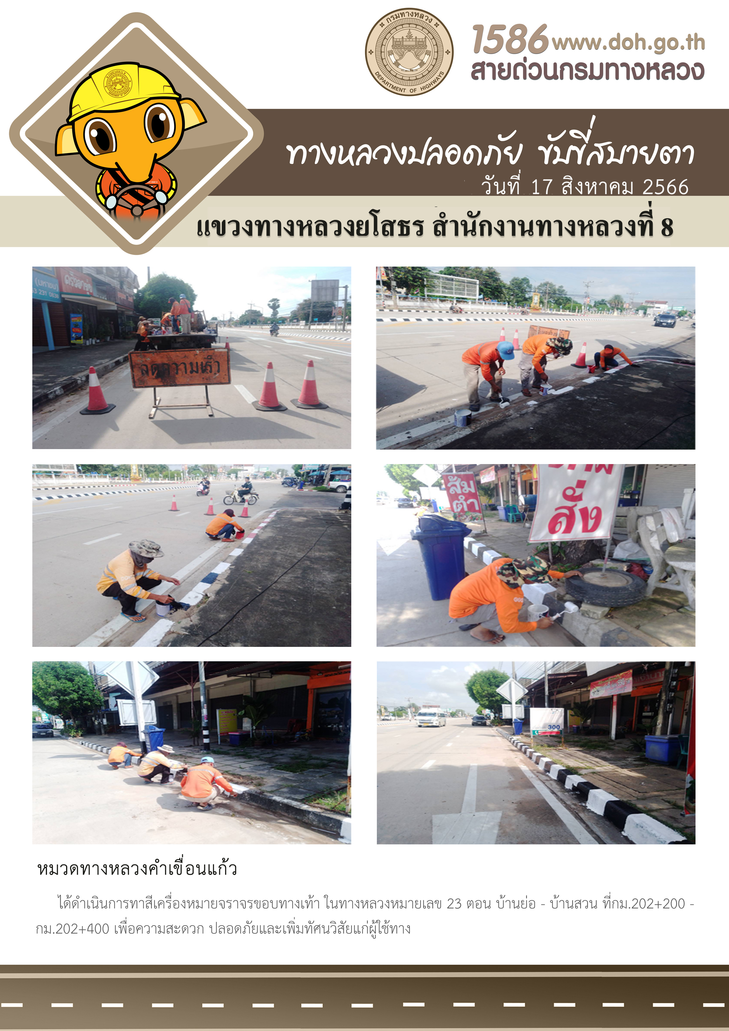 วันที่ 17 สิงหาคม 2566 หมวดทางหลวงคำเขื่อนแก้ว ได้ดำเนินการทาสีเครื่องหมายจราจรขอบทางเท้า ในทางหลวงหมายเลข 23 ตอน บ้านย่อ - บ้านสวน ที่กม.202+200 - กม.202+400 เพื่อความสะดวก ปลอดภัยและเพิ่มทัศนวิสัยแก่ผู้ใช้ทาง