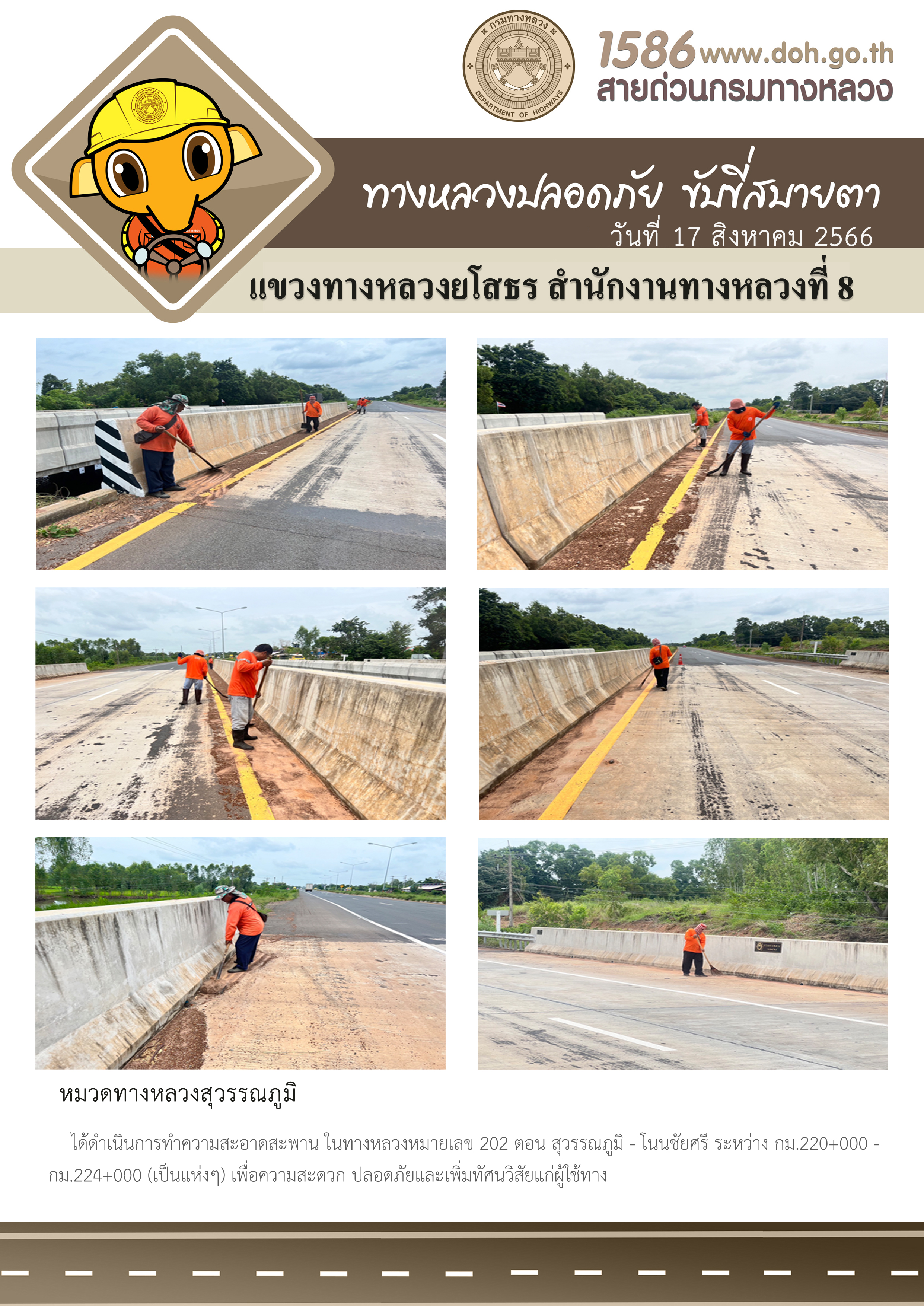 วันที่ 17 สิงหาคม 2566 หมวดทางหลวงสุวรรณภูมิ ได้ดำเนินการทำความสะอาดสะพาน ในทางหลวงหมายเลข 202 ตอน สุวรรณภูมิ - โนนชัยศรี ระหว่าง กม.220+000 - กม.224+000 (เป็นแห่งๆ) เพื่อความสะดวก ปลอดภัยและเพิ่มทัศนวิสัยแก่ผู้ใช้ทาง