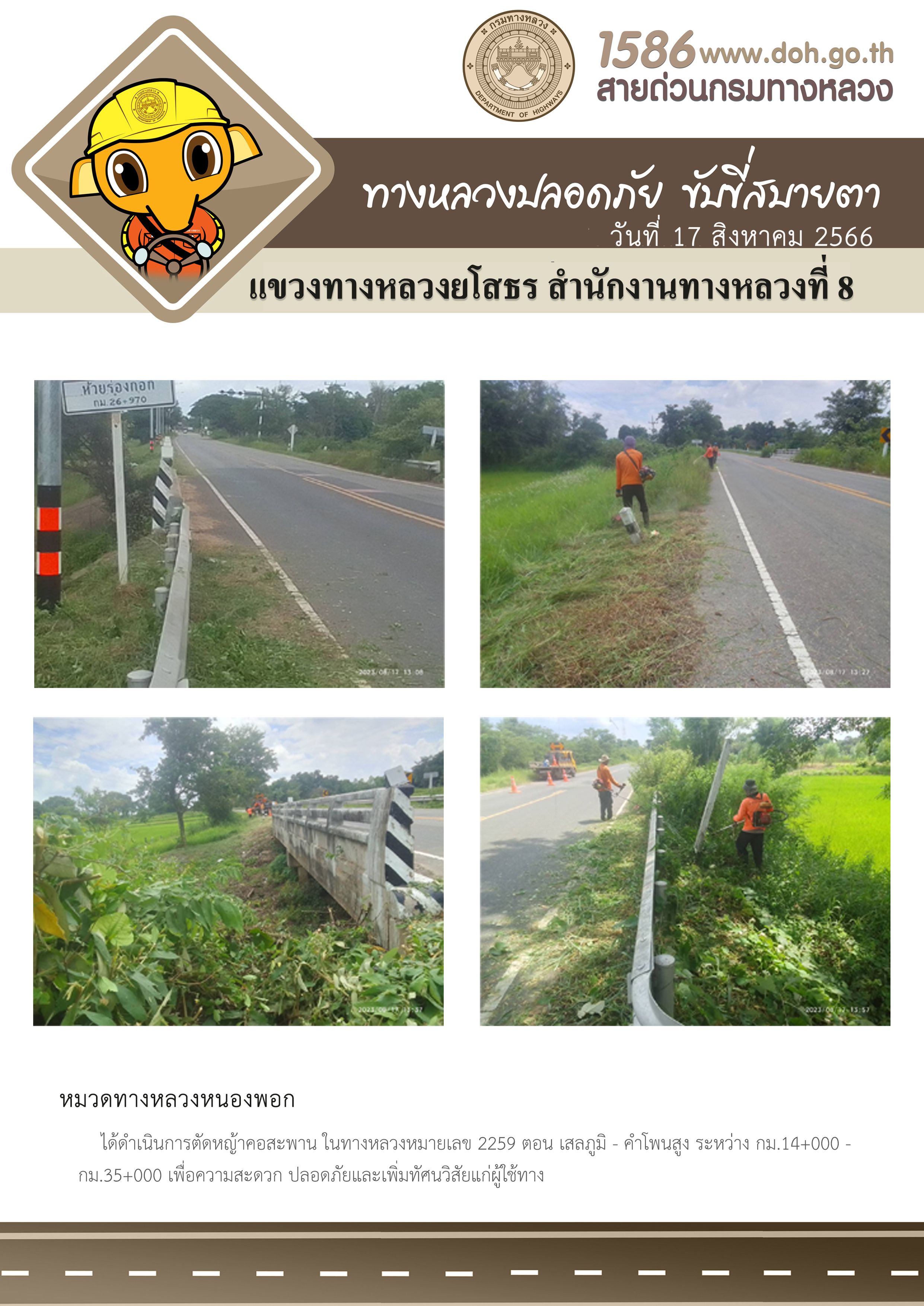 วันที่ 17 สิงหาคม 2566 หมวดทางหลวงหนองพอก ได้ดำเนินการตัดหญ้าคอสะพาน ในทางหลวงหมายเลข 2259 ตอน เสลภูมิ - คำโพนสูง ระหว่าง กม.14+000 - กม.35+000 เพื่อความสะดวก ปลอดภัยและเพิ่มทัศนวิสัยแก่ผู้ใช้ทาง