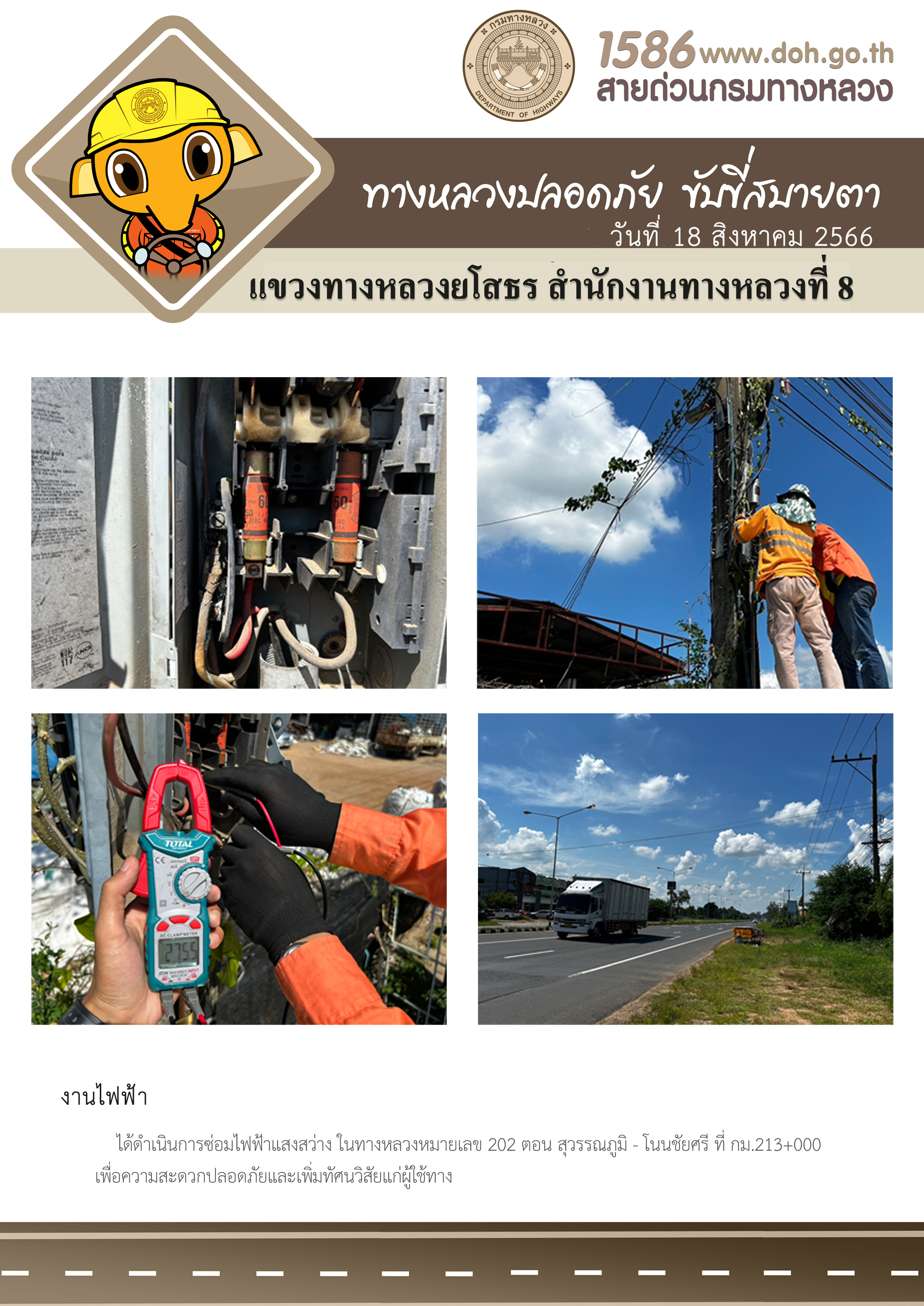 วันที่ 18 สิงหาคม 2566 งานไฟฟ้า ได้ดำเนินการซ่อมไฟฟ้าแสงสว่าง ในทางหลวงหมายเลข 202 ตอน สุวรรณภูมิ - โนนชัยศรี ที่ กม.213+000 เพื่อความสะดวกปลอดภัยและเพิ่มทัศนวิสัยแก่ผู้ใช้ทาง