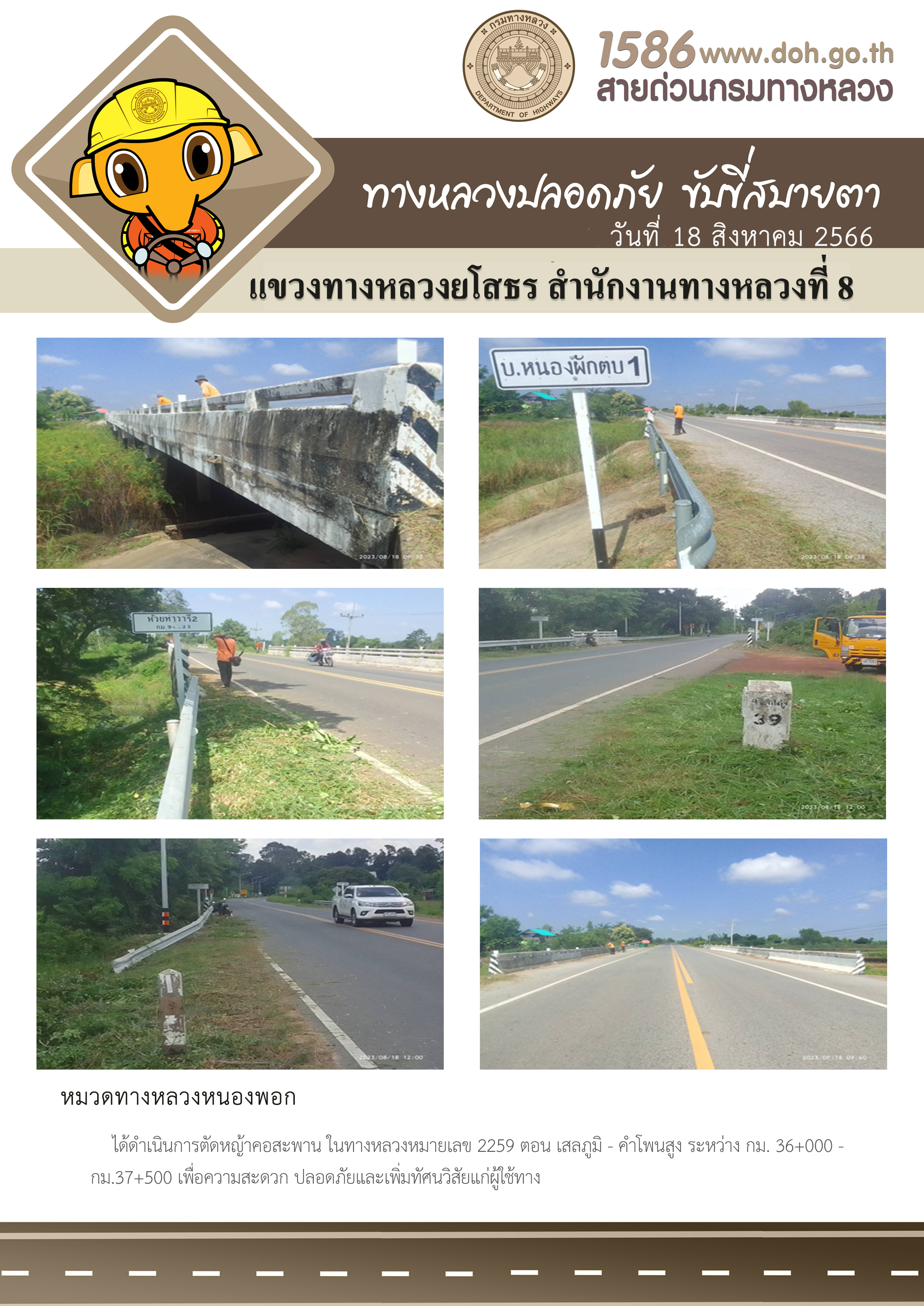 วันที่ 18 สิงหาคม 2566 หมวดทางหลวงหนองพอก ได้ดำเนินการตัดหญ้าคอสะพาน ในทางหลวงหมายเลข 2259 ตอน เสลภูมิ - คำโพนสูง ระหว่าง กม.36+000 - กม.37+500 เพื่อความสะดวก ปลอดภัยและเพิ่มทัศนวิสัยแก่ผู้ใช้ทาง