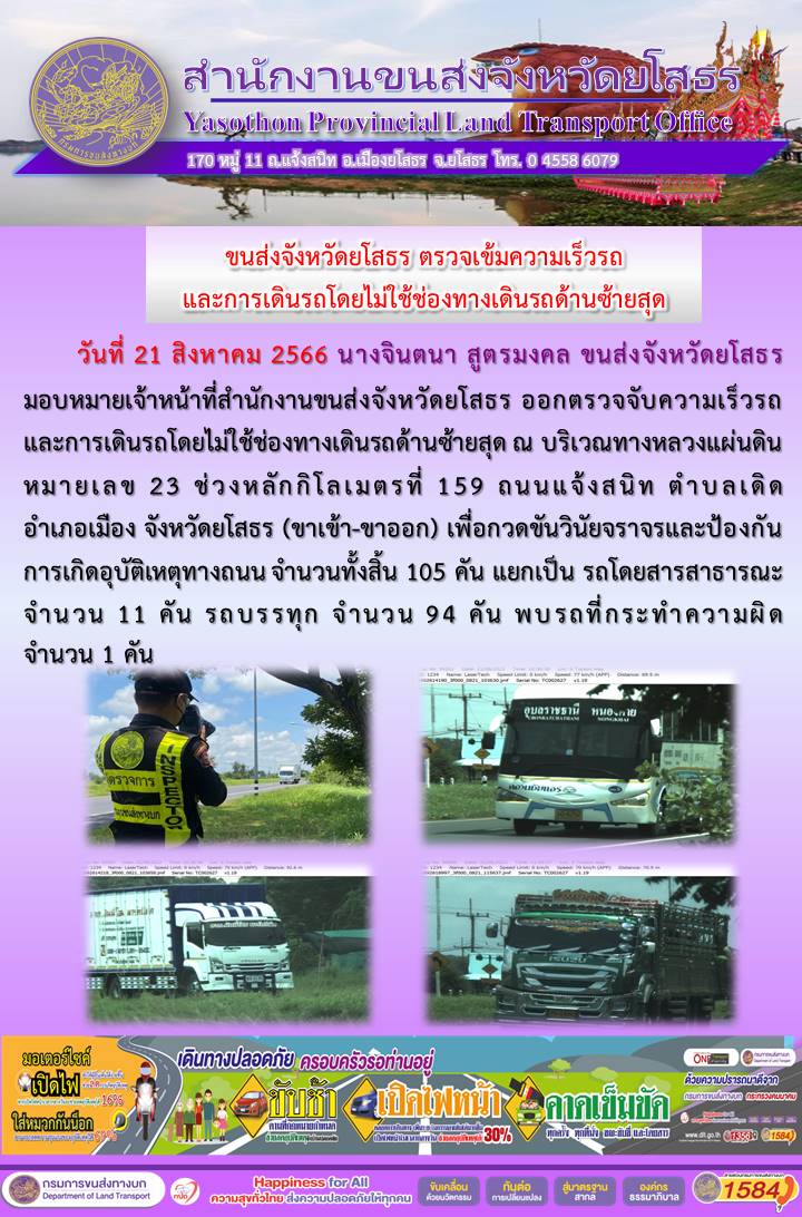 วันที่ 21 สิงหาคม 2566 เจ้าหน้าที่สำนักงานขนส่งจังหวัดยโสธร ออกตั้งจุดตรวจจับความเร็ว