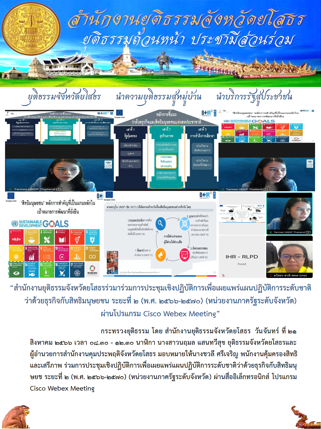 สำนักงานยุติธรรมจังหวัดยโสธรร่วมาร่วมการประชุมเชิงปฏิบัติการเพื่อเผยแพร่แผนปฏิบัติการระดับชาติว่าด้วยธุรกิจกับสิทธิมนุษยชน ระยะที่ 2 (พ.ศ. 2566-2570) (หน่วยงานภาครัฐระดับจังหวัด) ผ่านโปรแกรม Cisco Webex Meeting