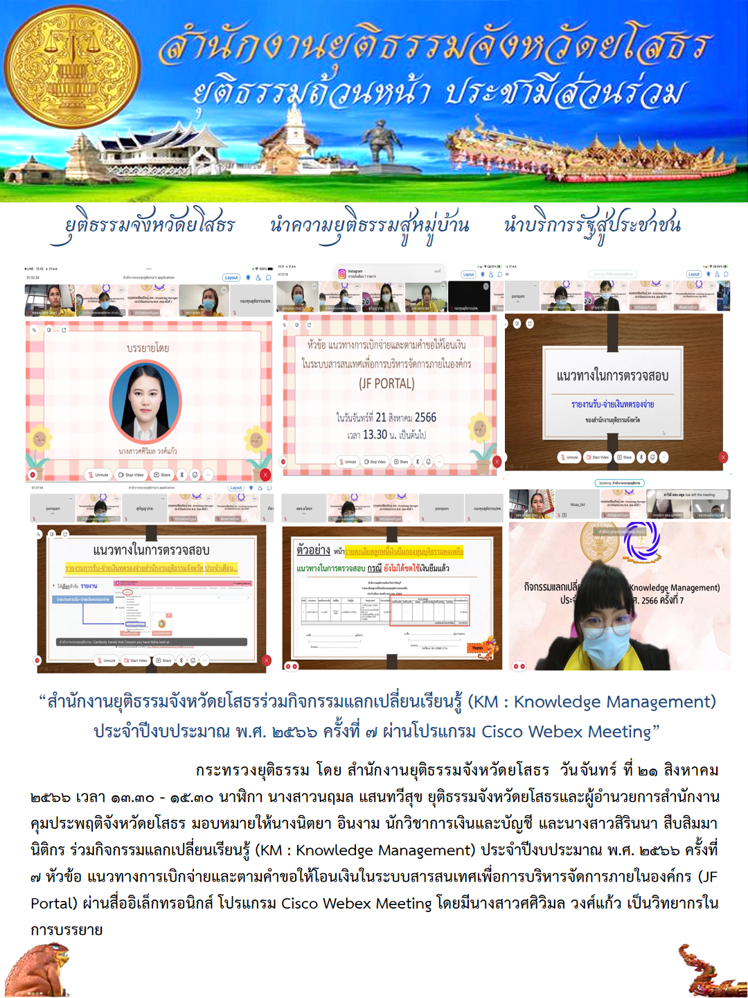 สำนักงานยุติธรรมจังหวัดยโสธรร่วมกิจกรรมแลกเปลี่ยนเรียนรู้ (KM : Knowledge Management) ประจำปีงบประมาณ พ.ศ. 2566 ครั้งที่ 7 ผ่านโปรแกรม Cisco Webex Meeting