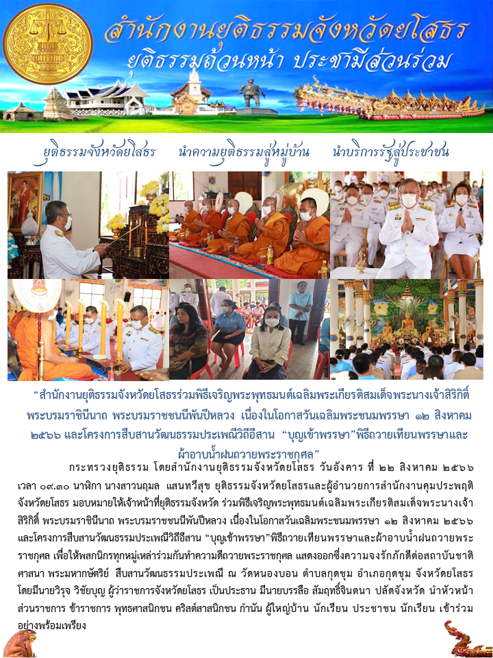 สำนักงานยุติธรรมจังหวัดยโสธรร่วมพิธีเจริญพระพุทธมนต์เฉลิมพระเกียรติสมเด็จพระนางเจ้าสิริกิติ์ พระบรมราชินีนาถ พระบรมราชชนนีพันปีหลวง เนื่องในโอกาสวันเฉลิมพระชนมพรรษา 12 สิงหาคม 2566 และโครงการสืบสานวัฒนธรรมประเพณีวิถีอีสาน “บุญเข้าพรรษา”พิธีถวายเทียนพ