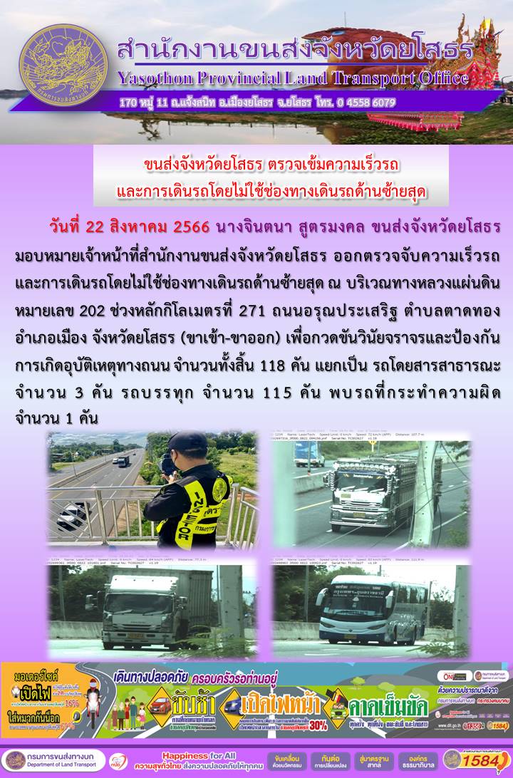 วันที่ 22 สิงหาคม 2566 เจ้าหน้าที่สำนักงานขนส่งจังหวัดยโสธร ออกตั้งจุดตรวจจับความเร็ว
