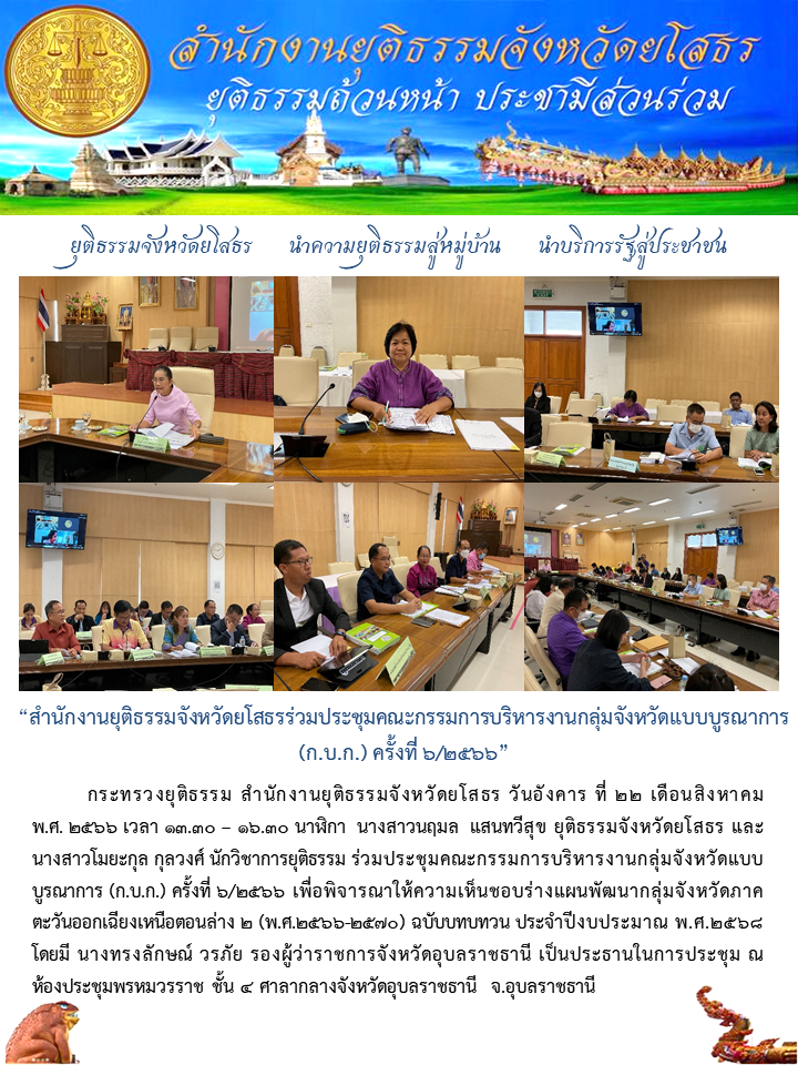 วันที่ 22 ส.ค. 2566 (14:24 น.)กระทรวงยุติธรรม สำนักงานยุติธรรมจังหวัดยโสธร วันอังคาร ที่ 22 เดือนสิงหาคม พ.ศ. 2566 เวลา 13.30 – 16.30 นาฬิกา นางสาวนฤมล แสนทวีสุข ยุติธรรมจังหวัดยโสธร และนางสาวโมยะกุล กุลวงศ์ นักวิชาการยุติธรรม ร่วมประชุมคณะกรรมการบริหารงานกลุ่มจังหวัดแบบบูรณาการ (ก.บ.ก.) ครั้งที่ 6/2566 เพื่อพิจารณาให้ความเห็นชอบร่างแผนพัฒนากลุ่มจังหวัดภาคตะวันออกเฉียงเหนือตอนล่าง 2 (พ.ศ.2566-2570) ฉบับบทบทวน ประจำปีงบประมาณ พ.ศ.2568 โดยมี นางทรงลักษณ์ วรภัย รองผู้ว่าราชการจังหวัดอุบลราชธานี เป็นประธานในการประชุม ณ ห้องประชุมพรหมวรราช ชั้น 4 ศาลากลางจังหวัดอุบลราชธานี จ.อุบลราชธานี