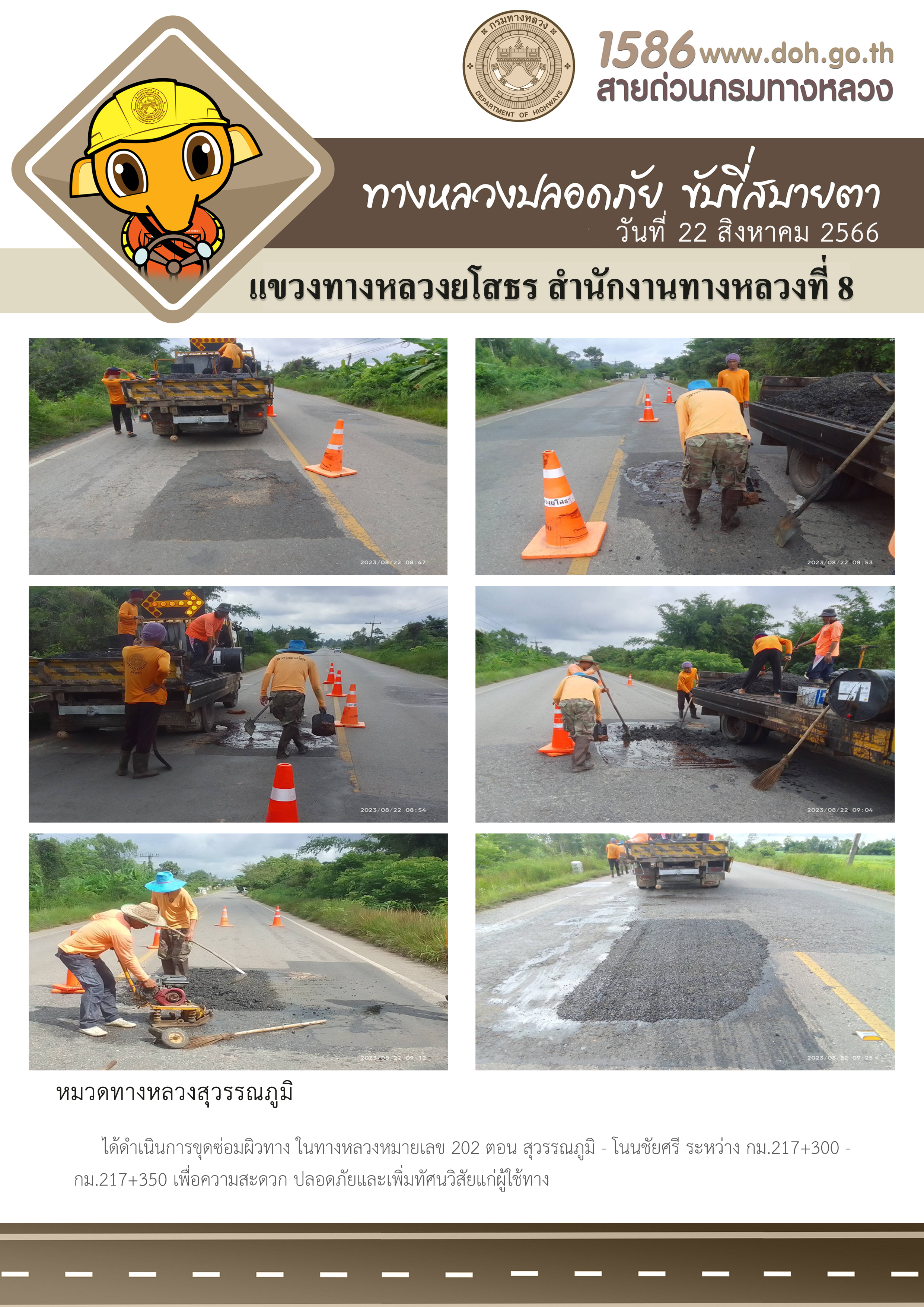 วันที่ 22 สิงหาคม 2566 หมวดทางหลวงสุวรรณภูมิ ได้ดำเนินการขุดซ่อมผิวทาง ในทางหลวงหมายเลข 202 ตอน สุวรรณภูมิ - โนนชัยศรี ระหว่าง กม.217+300 - กม.217+350 เพื่อความสะดวก ปลอดภัยและเพิ่มทัศนวิสัยแก่ผู้ใช้ทาง