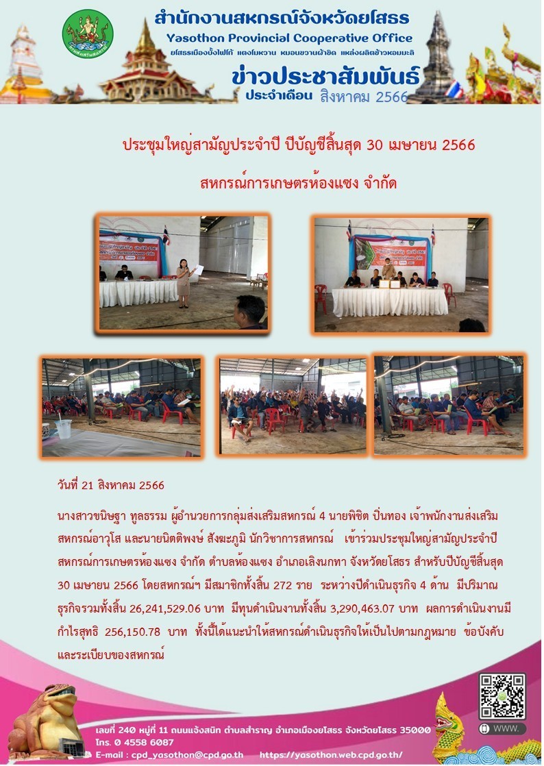 นางสาวขนิษฐา ทูลธรรม ผู้อำนวยการกลุ่มส่งเสริมสหกรณ์ 4 พร้อมด้วยนายพิชิต ปิ่นทอง เจ้าพนักงานส่งเสริมสหกรณ์อาวุโส พร้อมด้วยเจ้าหน้าที่ส่งเสริมสหกรณ์ เข้าร่วมประชุมใหญ่ประจำปี สหกรณ์การเกษตรห้องแซง จำกัด