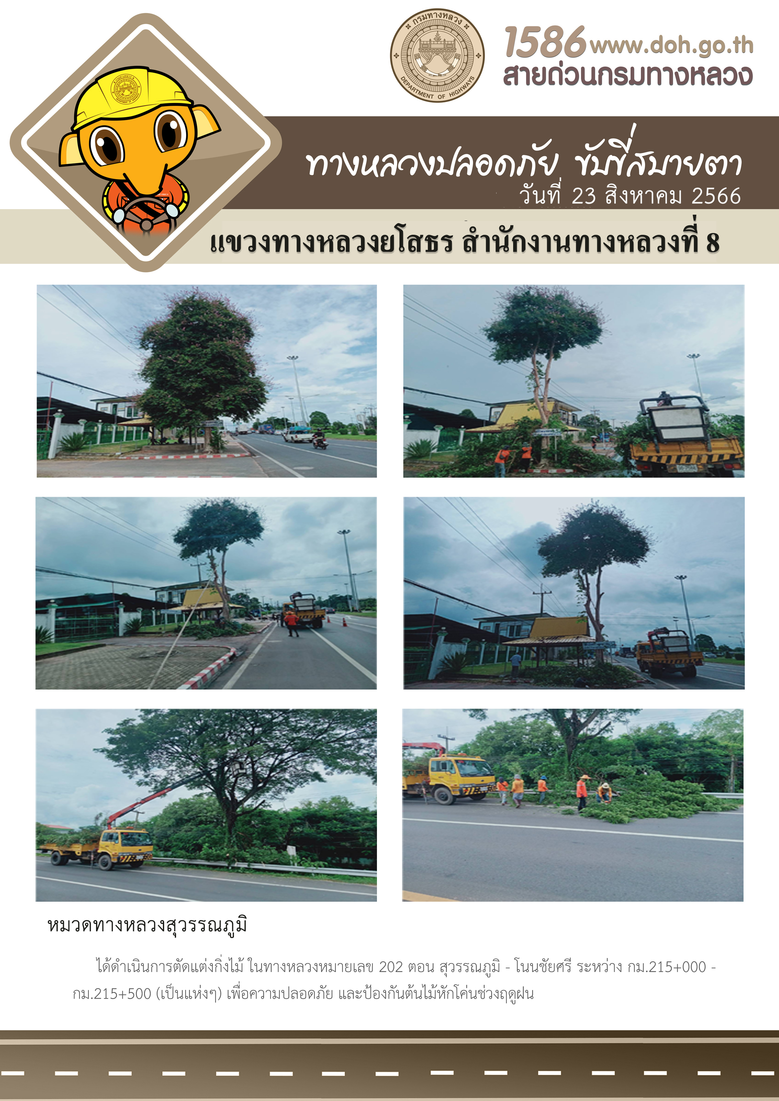 วันที่ 23 สิงหาคม 2566 หมวดทางหลวงสุวรรณภูมิ ได้ดำเนินการตัดแต่งกิ่งไม้ ในทางหลวงหมายเลข 202 ตอน สุวรรณภูมิ - โนนชัยศรี ระหว่าง กม.215+000 - กม.215+500 (เป็นแห่งๆ) เพื่อความปลอดภัย และป้องกันต้นไม้หักโค่นช่วงฤดูฝน