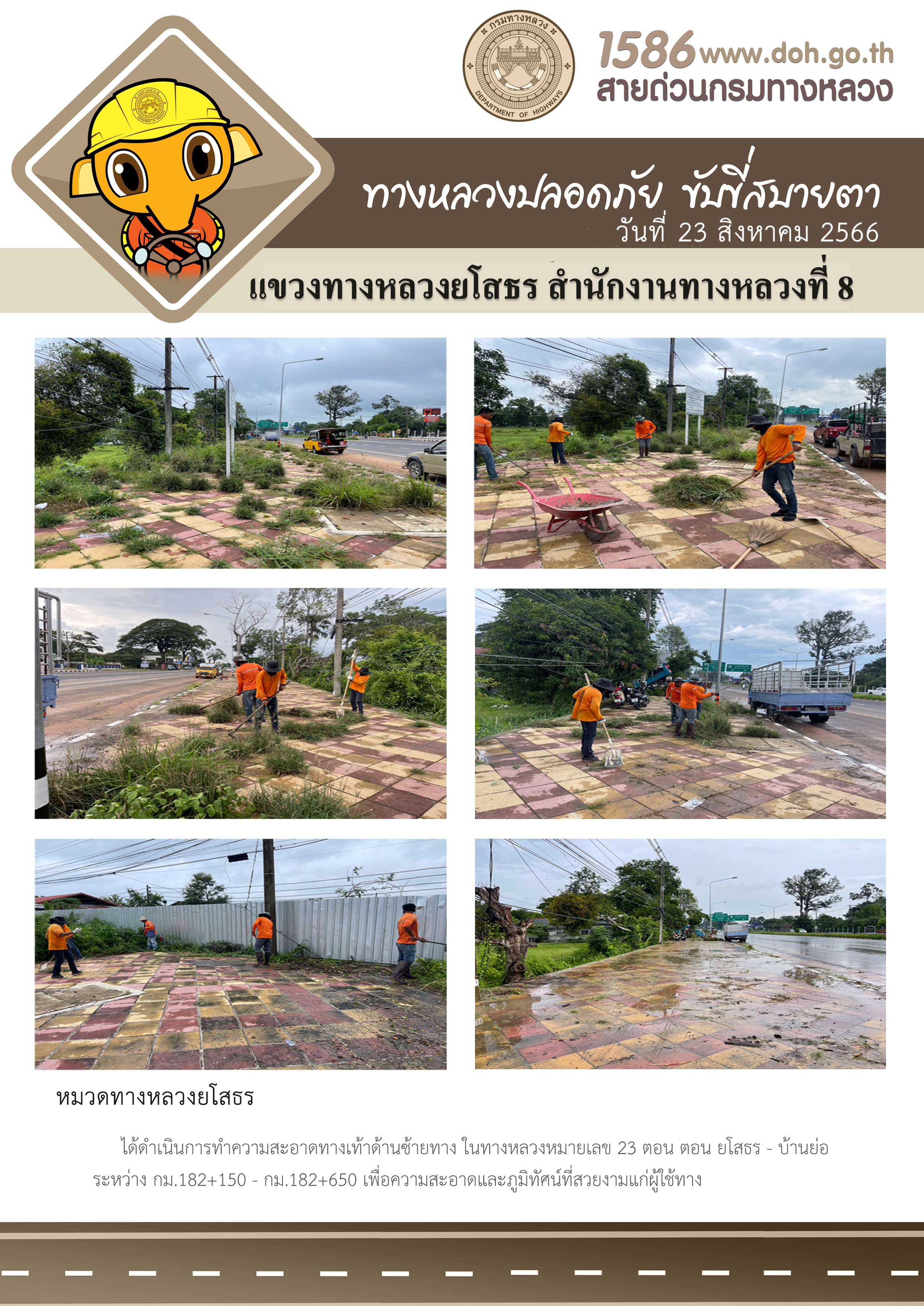 วันที่ 23 สิงหาคม 2566 หมวดทางหลวงยโสธร ได้ดำเนินการทำความสะอาดทางเท้าด้านซ้ายทาง ในทางหลวงหมายเลข 23 ตอน ตอน ยโสธร - บ้านย่อ ระหว่าง กม.182+150 - กม.182+650 เพื่อความสะอาดและภูมิทัศน์ที่สวยงามแก่ผู้ใช้ทาง