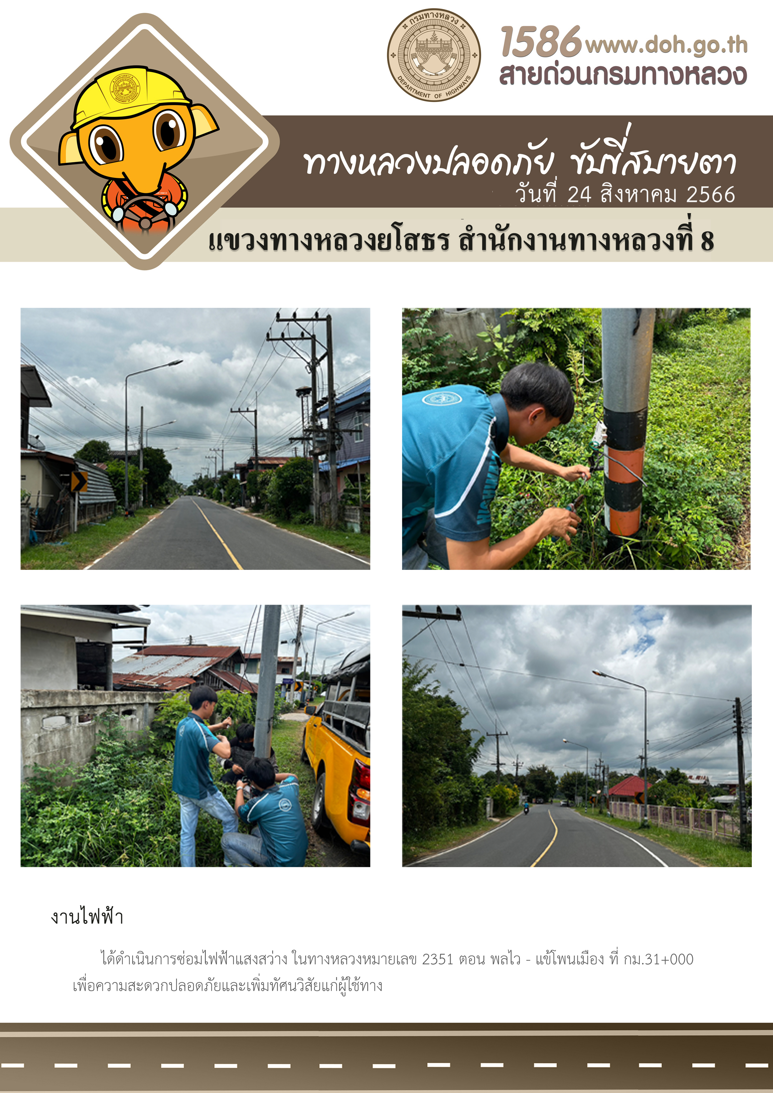 วันที่ 24 สิงหาคม 2566 งานไฟฟ้า ได้ดำเนินการซ่อมไฟฟ้าแสงสว่าง ในทางหลวงหมายเลข 2351 ตอน พลไว - แข้โพนเมือง ที่ กม.31+000 เพื่อความสะดวกปลอดภัยและเพิ่มทัศนวิสัยแก่ผู้ใช้ทาง