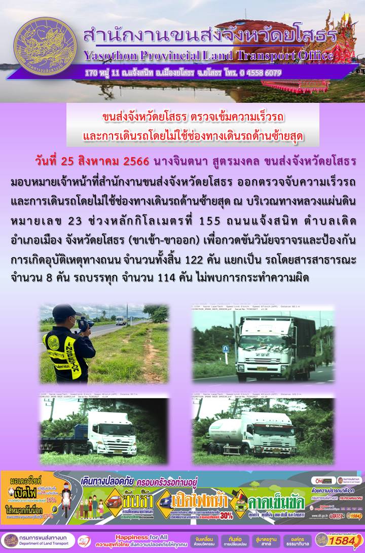 วันที่ 25 สิงหาคม 2566 เจ้าหน้าที่สำนักงานขนส่งจังหวัดยโสธร ออกตั้งจุดตรวจจับความเร็ว