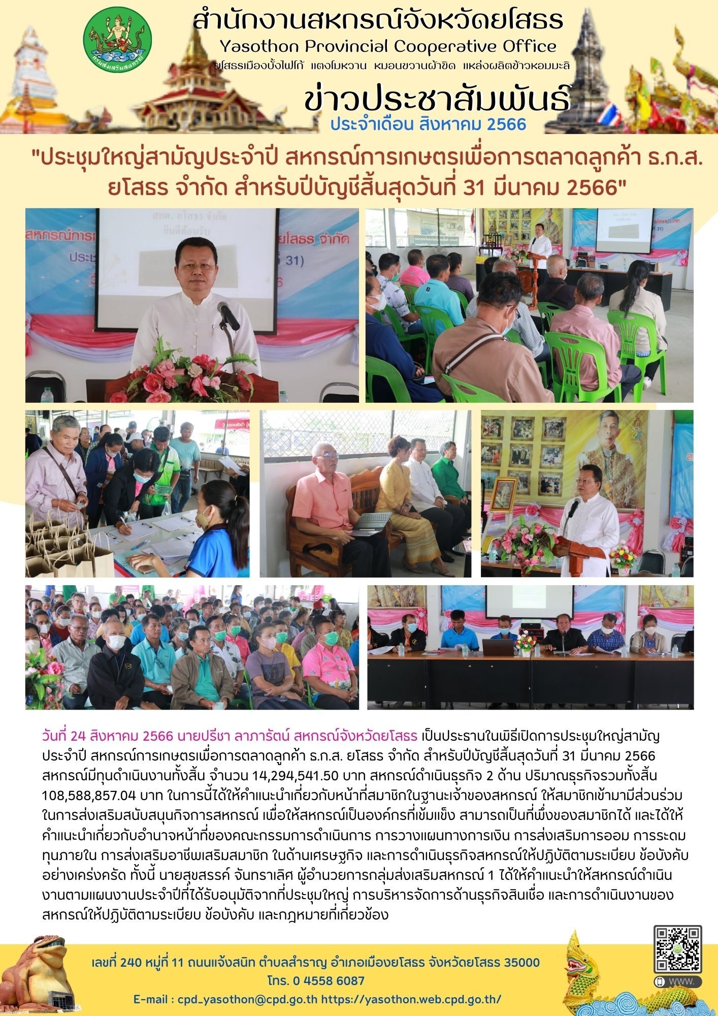 นายปรีชา ลาภารัตน์ สหกรณ์จังหวัดยโสธร เป็นประธานในพิธีเปิดการประชุมใหญ่ประจำปี สหกรณ์การเกษตรเพื่อการตลาดลูกค้า ธ.ก.ส ยโสธร จำกัด