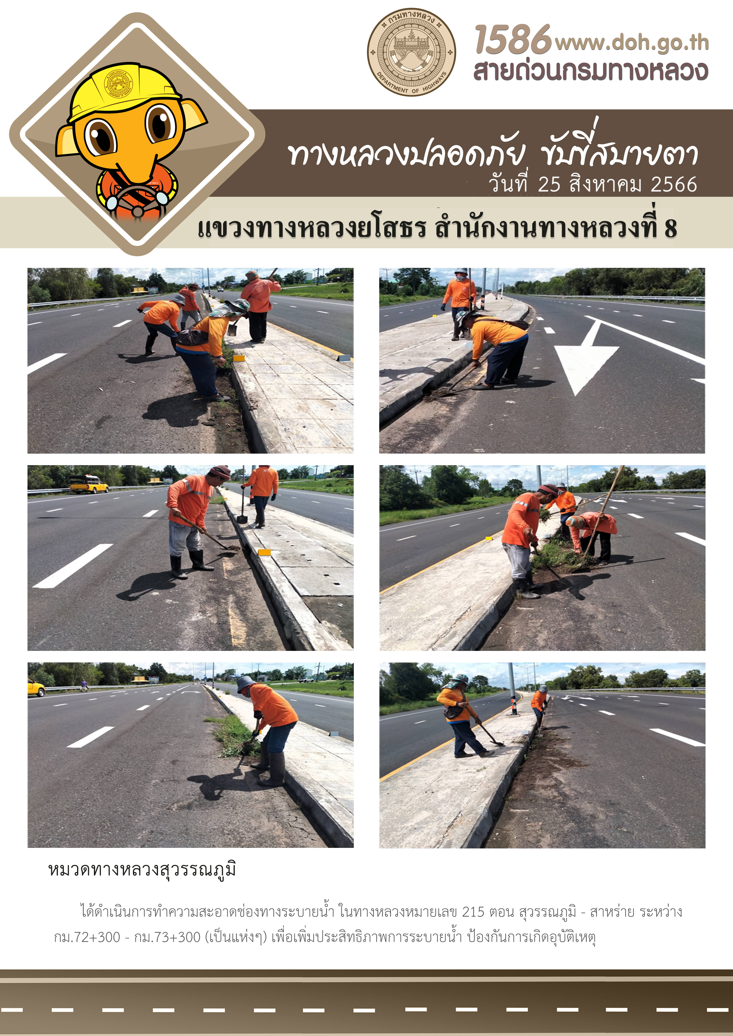 วันที่ 25 สิงหาคม 2566 หมวดทางหลวงสุวรรณภูมิ ได้ดำเนินการทำความสะอาดช่องทางระบายน้ำ ในทางหลวงหมายเลข 215 ตอน สุวรรณภูมิ - สาหร่าย ระหว่าง กม.72+300 - กม.73+300 (เป็นแห่งๆ) เพื่อเพิ่มประสิทธิภาพการระบายน้ำ ป้องกันการเกิดอุบัติเหตุ