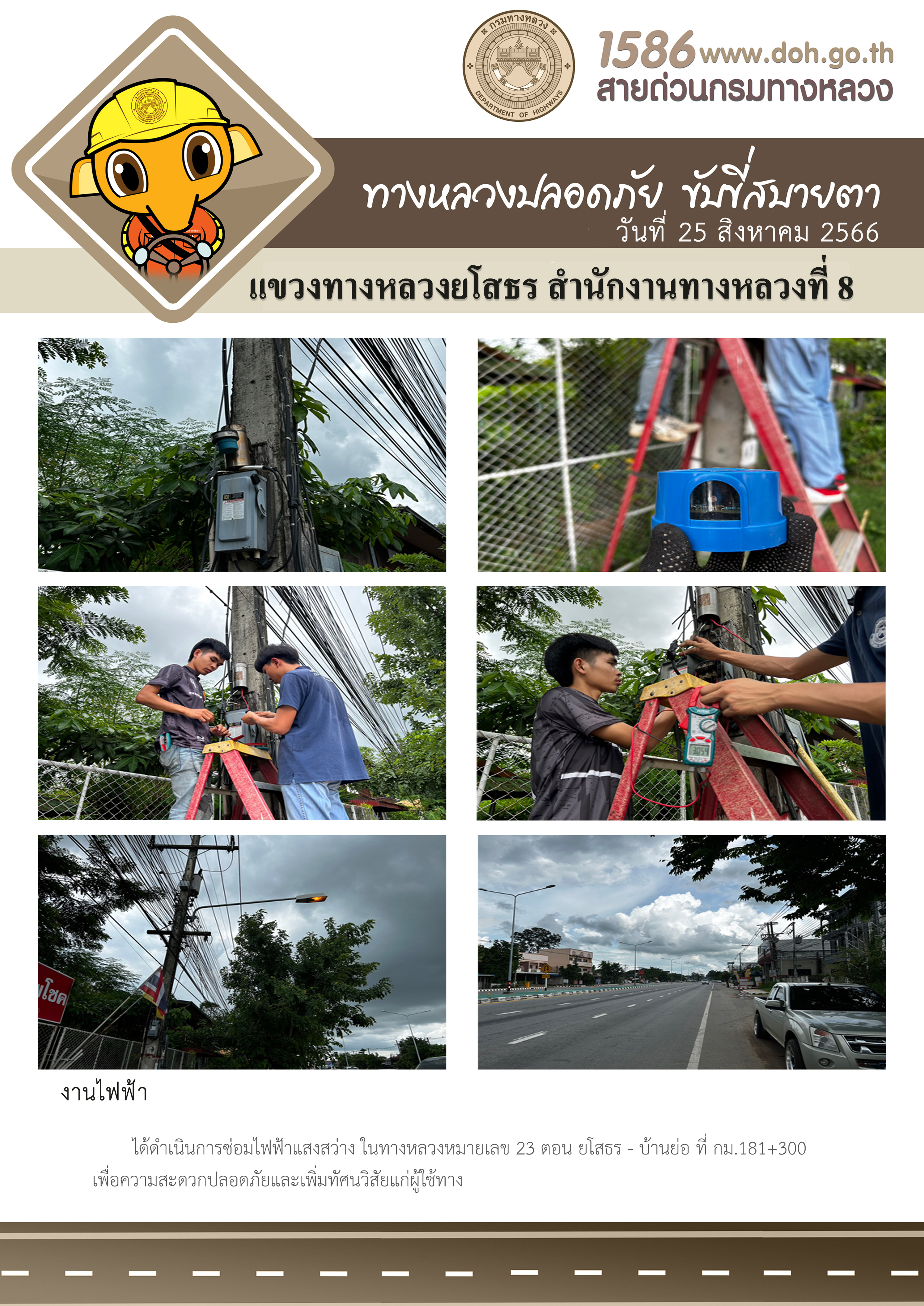 วันที่ 25 สิงหาคม 2566 งานไฟฟ้า ได้ดำเนินการซ่อมไฟฟ้าแสงสว่าง ในทางหลวงหมายเลข 23 ตอน ยโสธร - บ้านย่อ ที่ กม.181+300 เพื่อความสะดวกปลอดภัยและเพิ่มทัศนวิสัยแก่ผู้ใช้ทาง