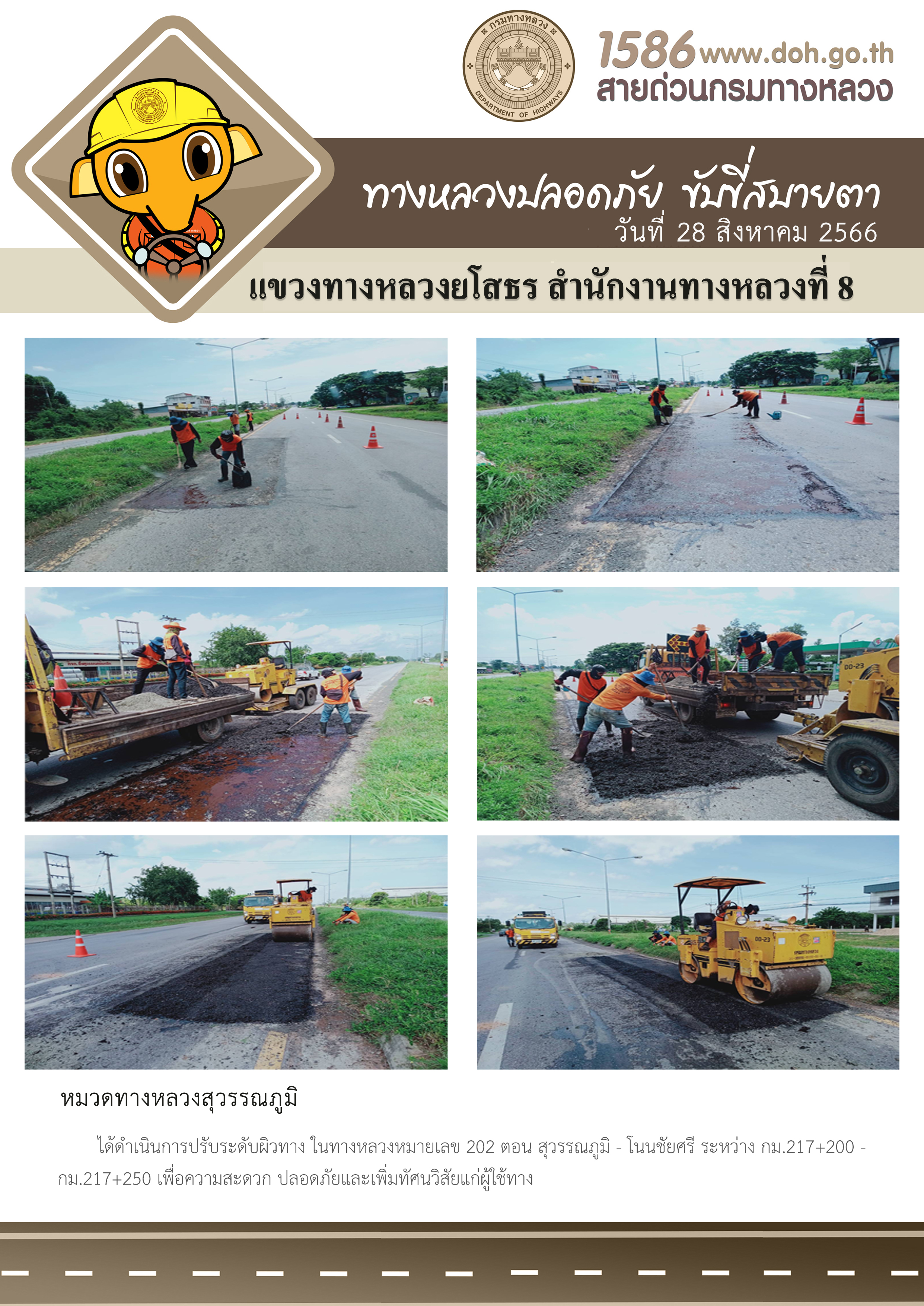 วันที่ 28 สิงหาคม 2566 หมวดทางหลวงสุวรรณภูมิ ได้ดำเนินการปรับระดับผิวทาง ในทางหลวงหมายเลข 202 ตอน สุวรรณภูมิ - โนนชัยศรี ระหว่าง กม.217+200 - กม.217+250 เพื่อความสะดวก ปลอดภัยและเพิ่มทัศนวิสัยแก่ผู้ใช้ทาง