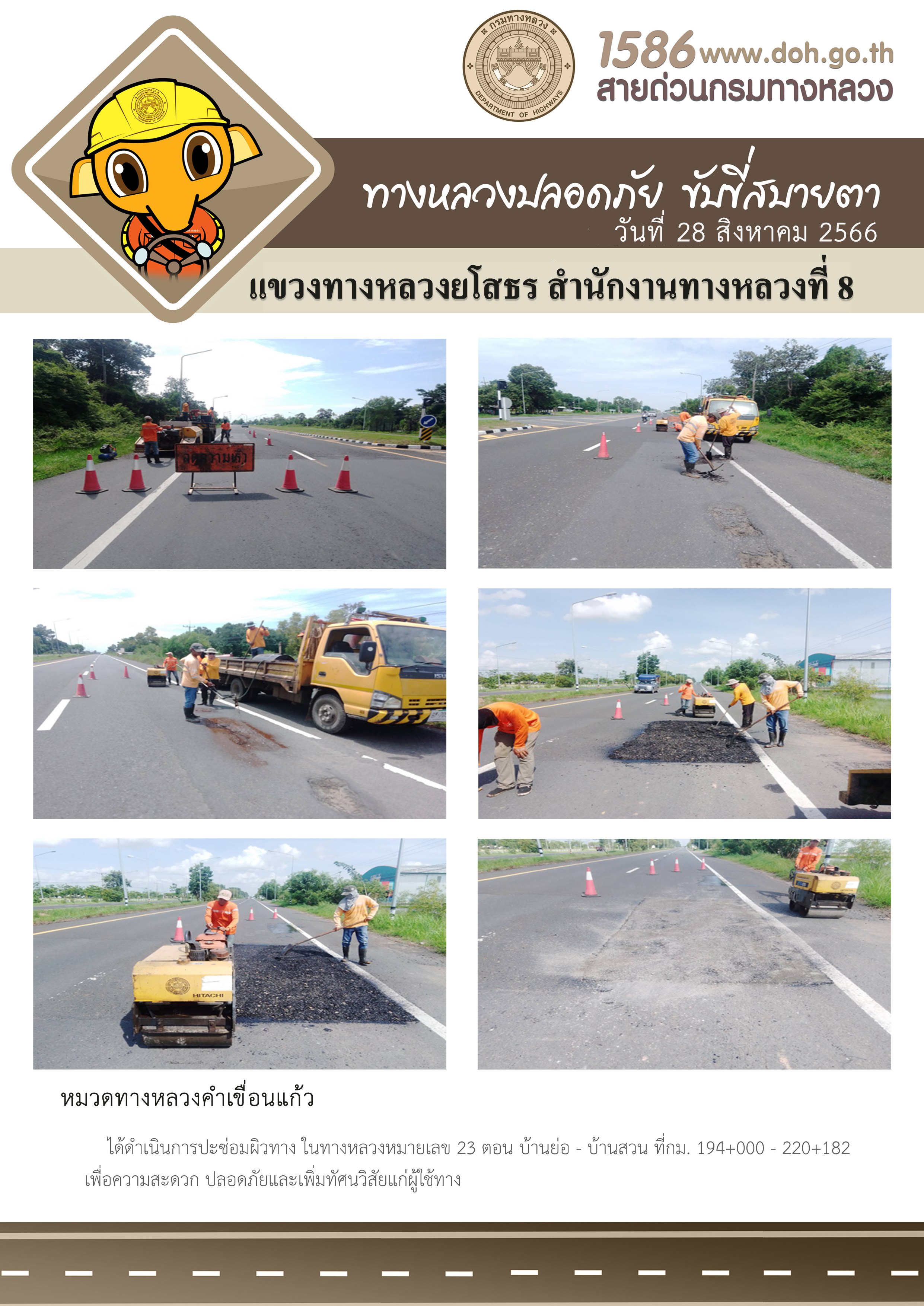 วันที่ 28 สิงหาคม 2566 หมวดทางหลวงคำเขื่อนแก้ว ได้ดำเนินการปะซ่อมผิวทาง ในทางหลวงหมายเลข 23 ตอน บ้านย่อ - บ้านสวน ที่กม.194+000 - กม.220+182 เพื่อความสะดวก ปลอดภัยและเพิ่มทัศนวิสัยแก่ผู้ใช้ทาง