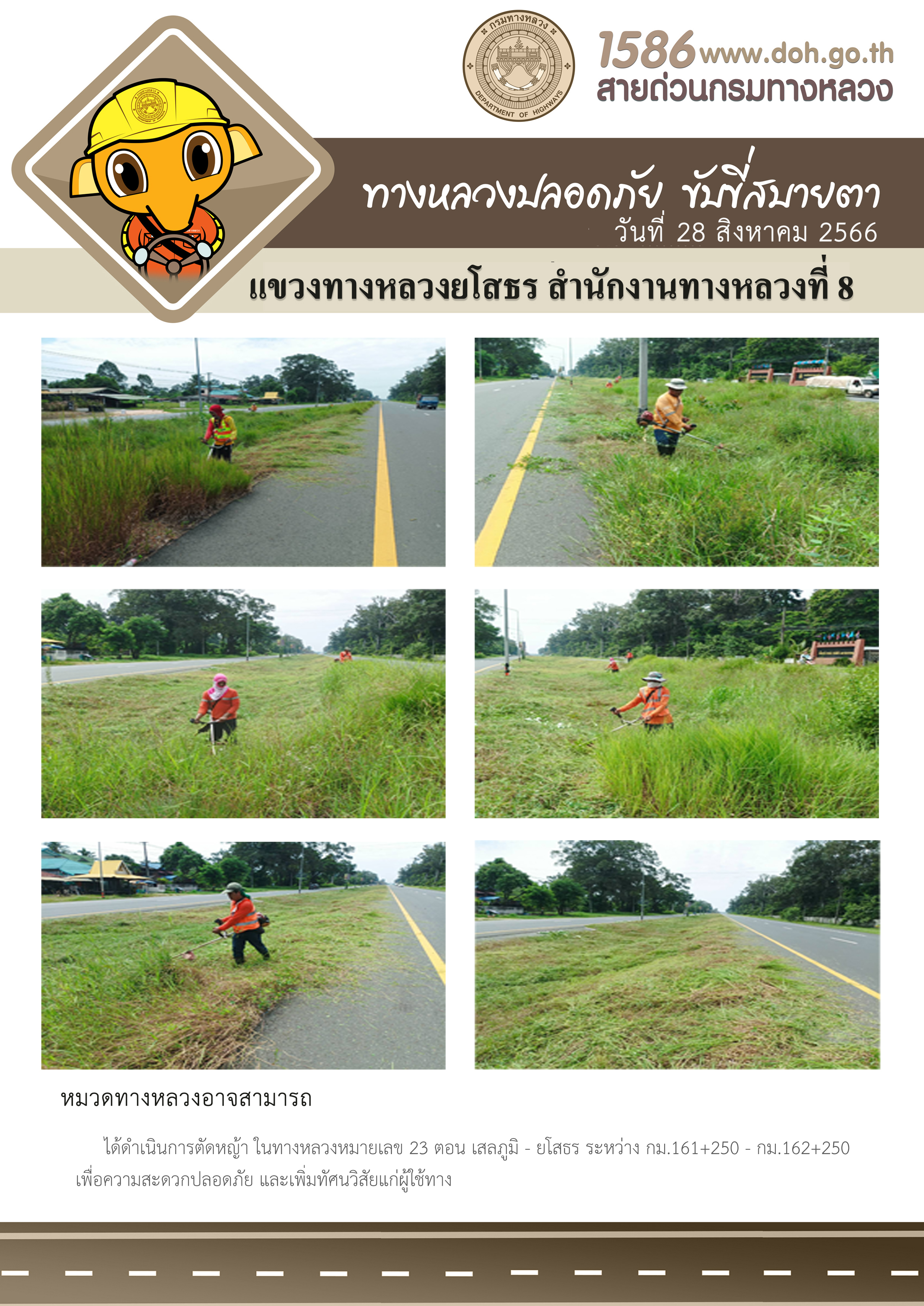 วันที่ 28 สิงหาคม 2566 หมวดทางหลวงอาจสามารถ ได้ดำเนินการตัดหญ้า ในทางหลวงหมายเลข 23 ตอน เสลภูมิ - ยโสธร ระหว่าง กม.161+250 - กม.162+250 เพื่อความสะดวกปลอดภัย และเพิ่มทัศนวิสัยแก่ผู้ใช้ทาง
