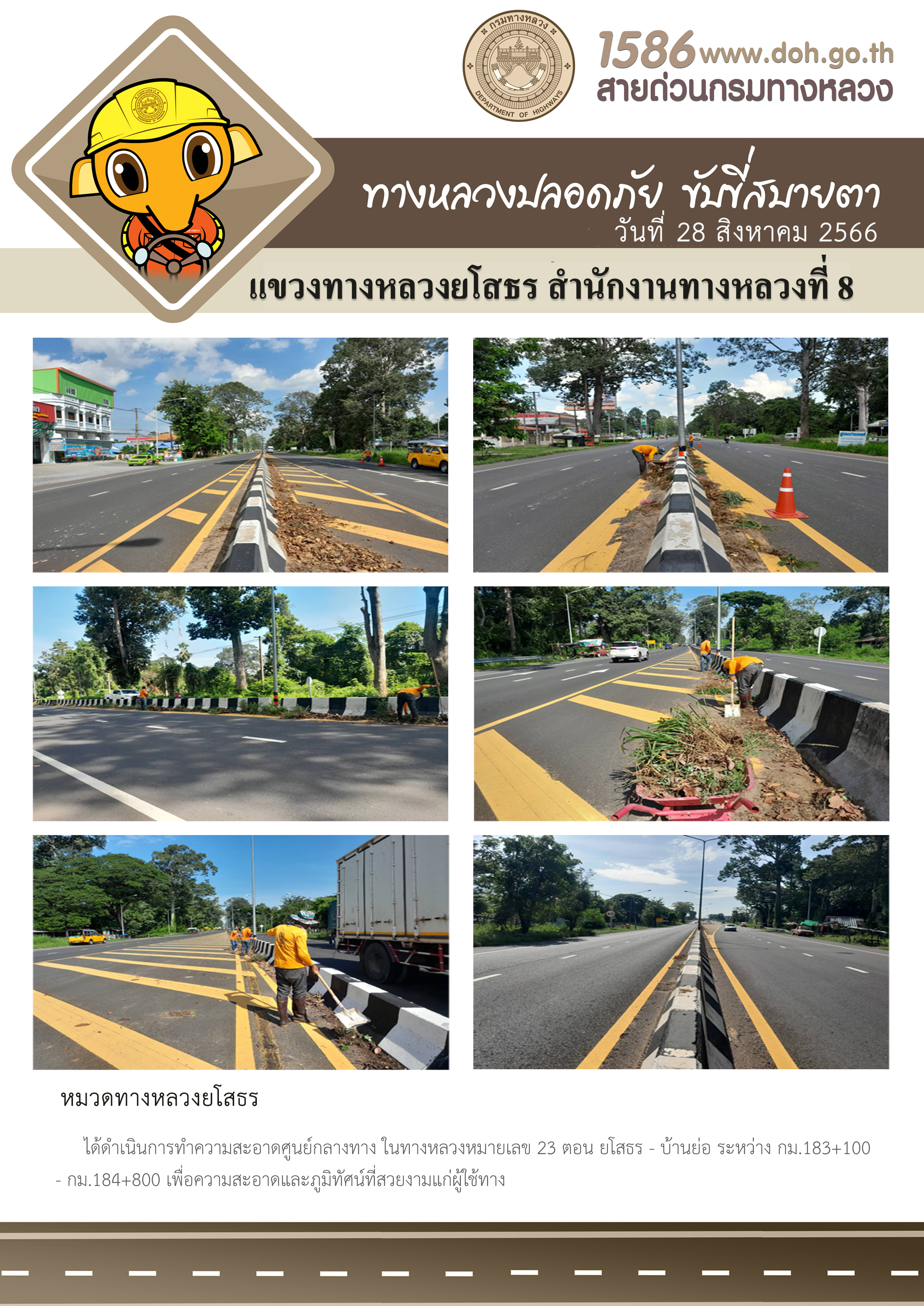 วันที่ 28 สิงหาคม 2566 หมวดทางหลวงยโสธร ได้ดำเนินการทำความสะอาดศูนย์กลางทาง ในทางหลวงหมายเลข 23 ตอน ยโสธร - บ้านย่อ ระหว่าง กม.183+100 - กม.184+800 เพื่อความสะอาดและภูมิทัศน์ที่สวยงามแก่ผู้ใช้ทาง