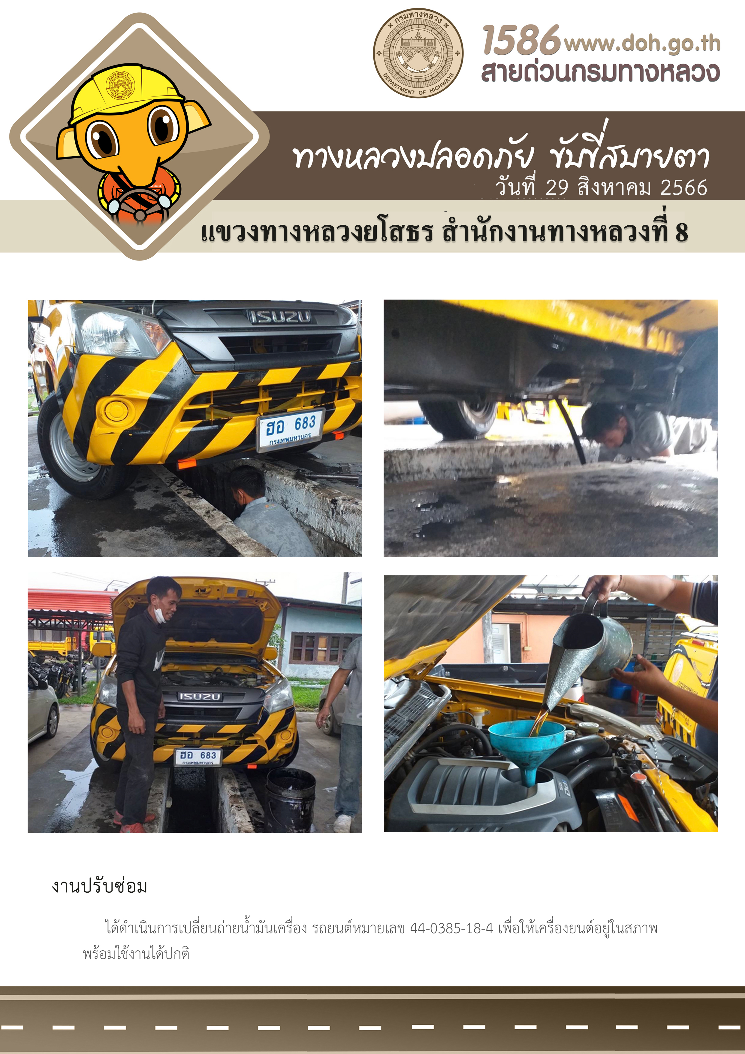 วันที่ 29 สิงหาคม 2566 งานปรับซ่อม ได้ดำเนินการเปลี่ยนถ่ายน้ำมันเครื่อง รถยนต์หมายเลข 44-0385-18-4 เพื่อให้เครื่องยนต์อยู่ในสภาพ พร้อมใช้งานได้ปกติ