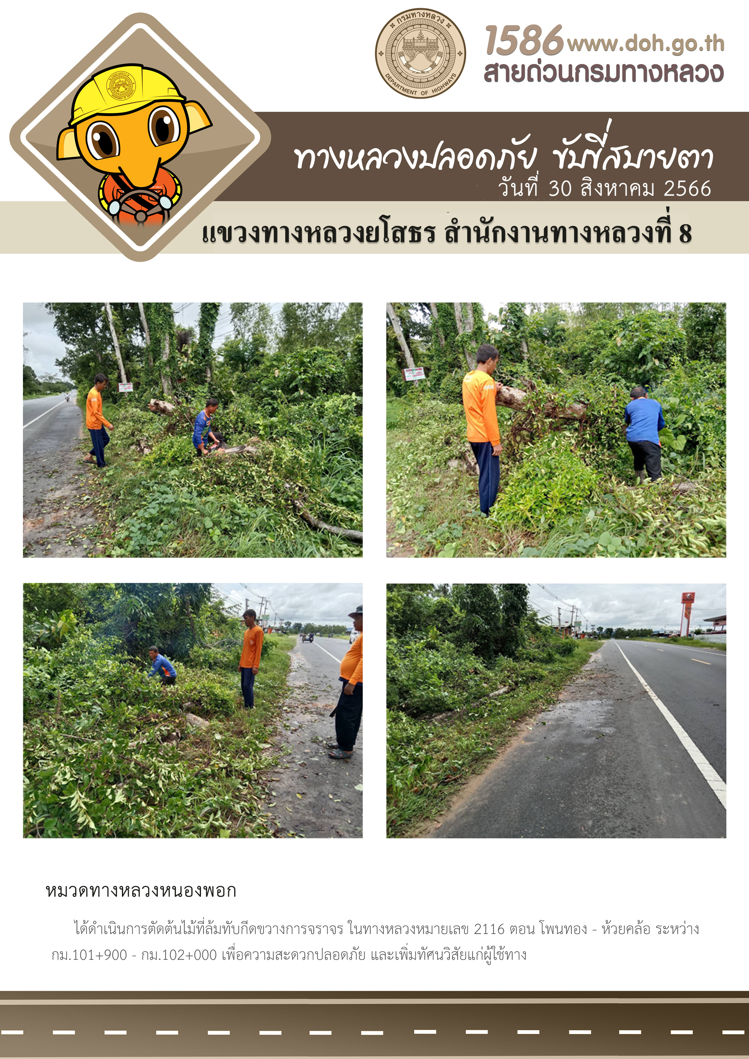 วันที่ 30 สิงหาคม 2566 หมวดทางหลวงหนองพอก ได้ดำเนินการตัดต้นไม้ที่ล้มทับกีดขวางการจราจร ในทางหลวงหมายเลข 2116 ตอน โพนทอง - ห้วยคล้อ ระหว่าง กม.101+900 - กม.102+000 เพื่อความสะดวกปลอดภัย และเพิ่มทัศนวิสัยแก่ผู้ใช้ทาง