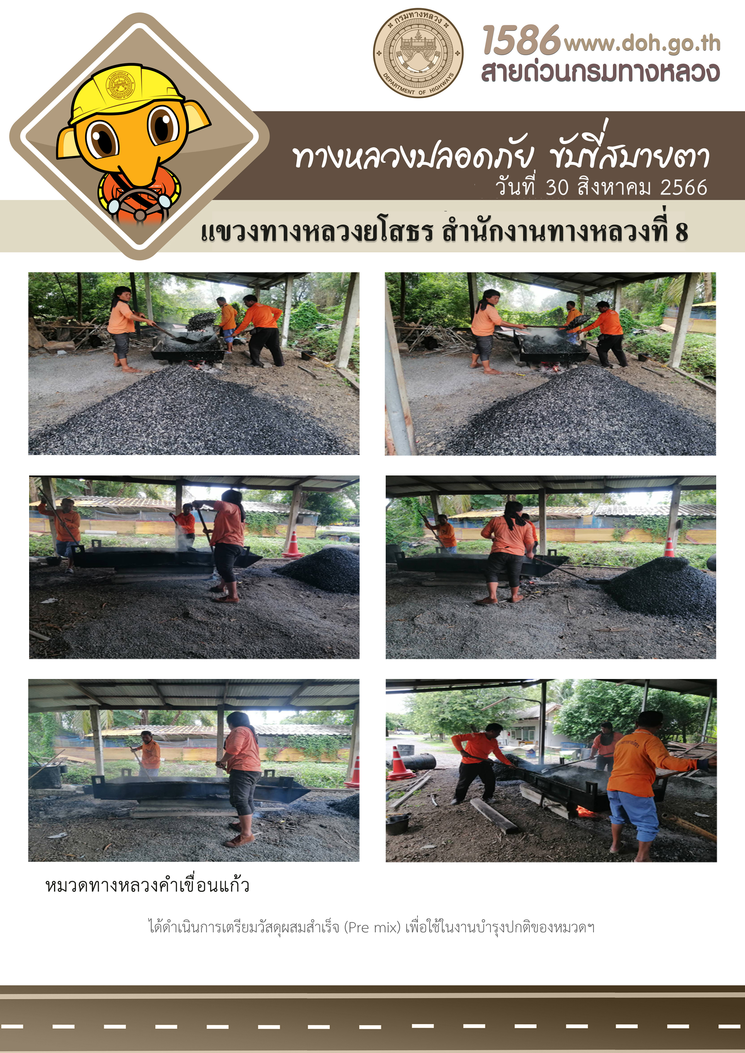 วันที่ 30 สิงหาคม 2566 หมวดทางหลวงคำเขื่อนแก้ว ได้ดำเนินการเตรียมวัสดุผสมสำเร็จ (Pre mix) เพื่อใช้ในงานบำรุงปกติของหมวดฯ