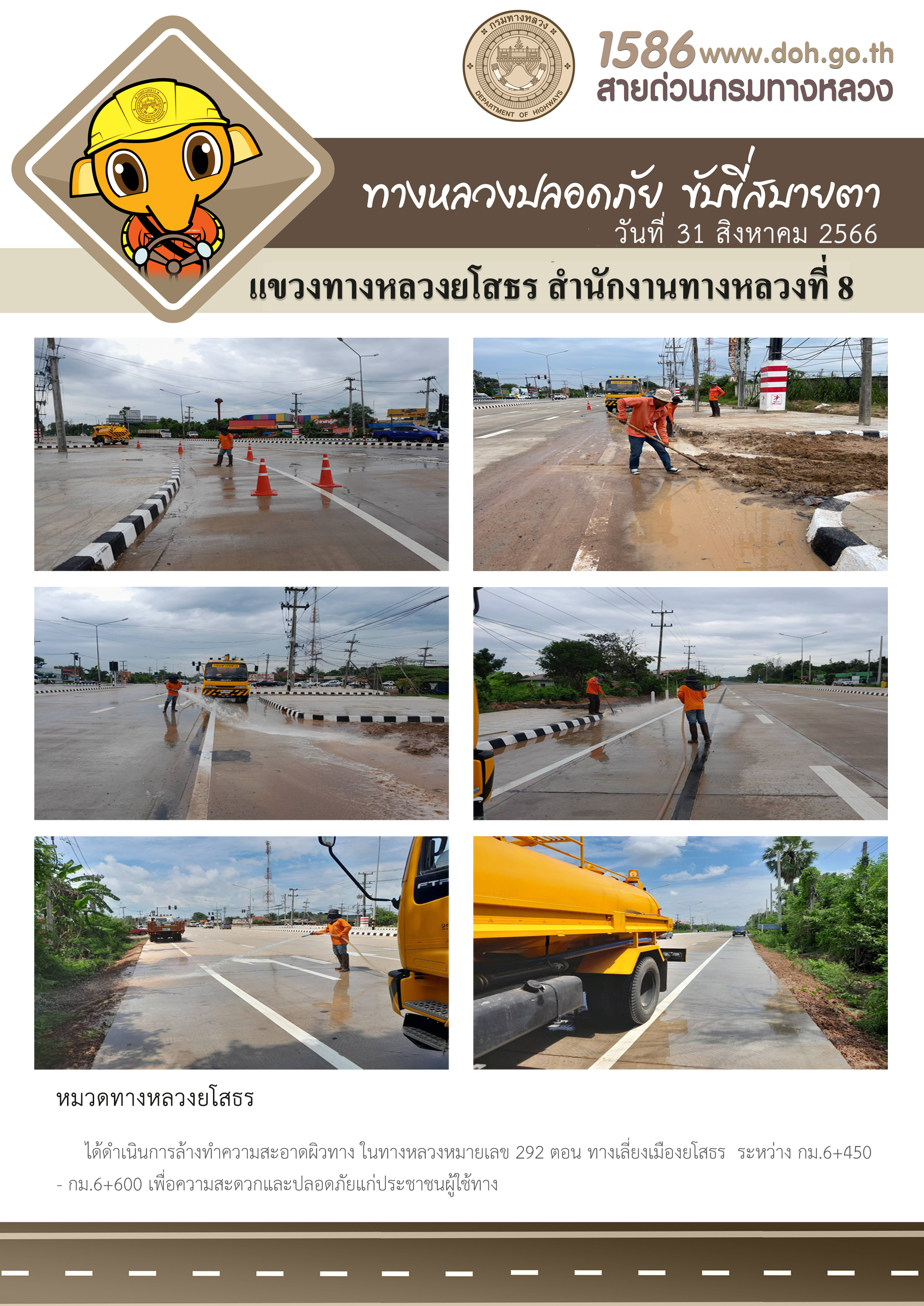 วันที่ 31 สิงหาคม 2566 หมวดทางหลวงยโสธร ได้ดำเนินการล้างทำความสะอาดผิวทาง ในทางหลวงหมายเลข 292 ตอน ทางเลี่ยงเมืองยโสธร ระหว่าง กม.6+450 - กม.6+600 เพื่อความสะดวกและปลอดภัยแก่ประชาชนผู้ใช้ทาง