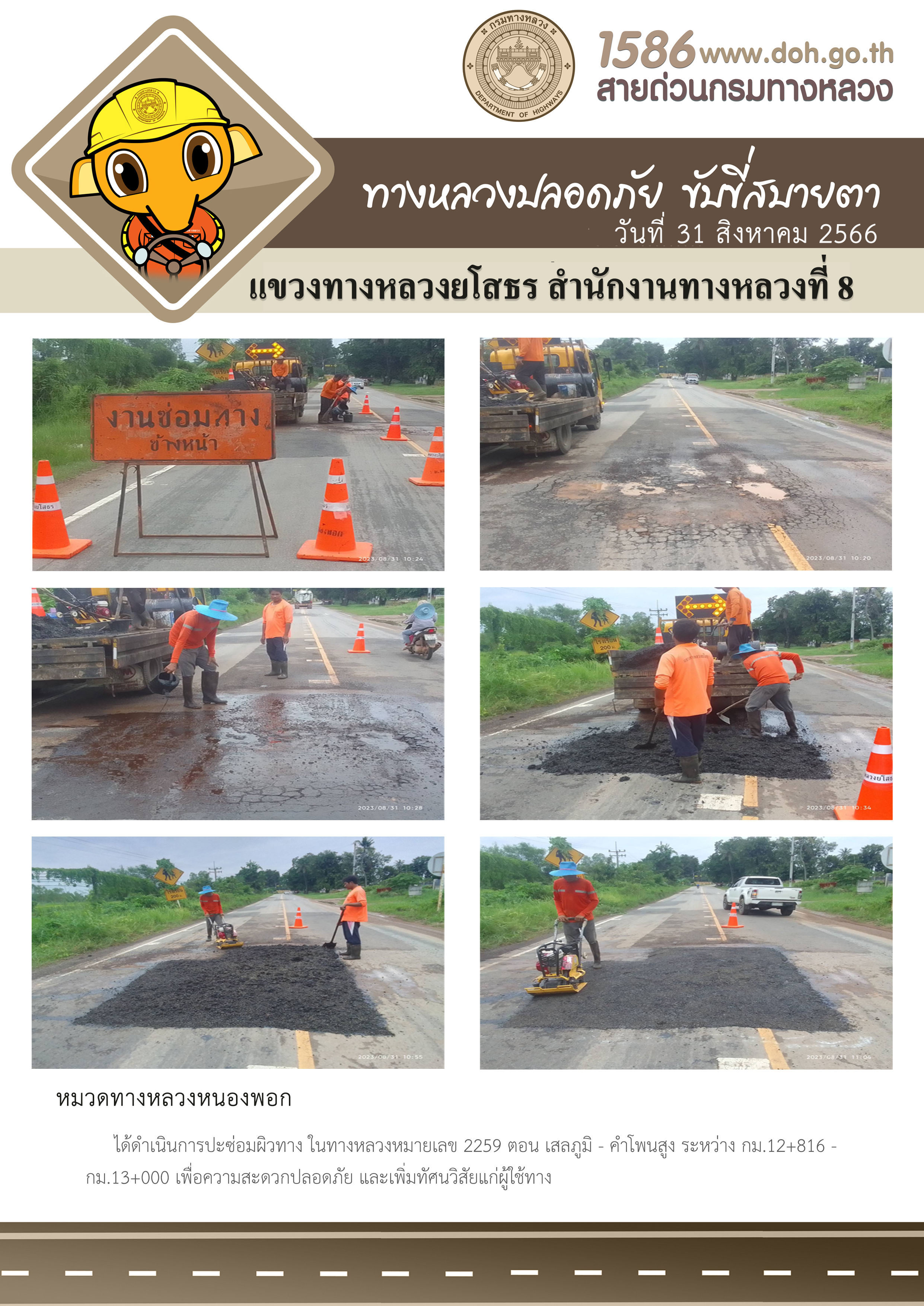วันที่ 31 สิงหาคม 2566 หมวดทางหลวงหนองพอก ได้ดำเนินการปะซ่อมผิวทาง ในทางหลวงหมายเลข 2259 ตอน เสลภูมิ - คำโพนสูง ระหว่าง กม.12+816 - กม.13+000 เพื่อความสะดวกปลอดภัย และเพิ่มทัศนวิสัยแก่ผู้ใช้ทาง