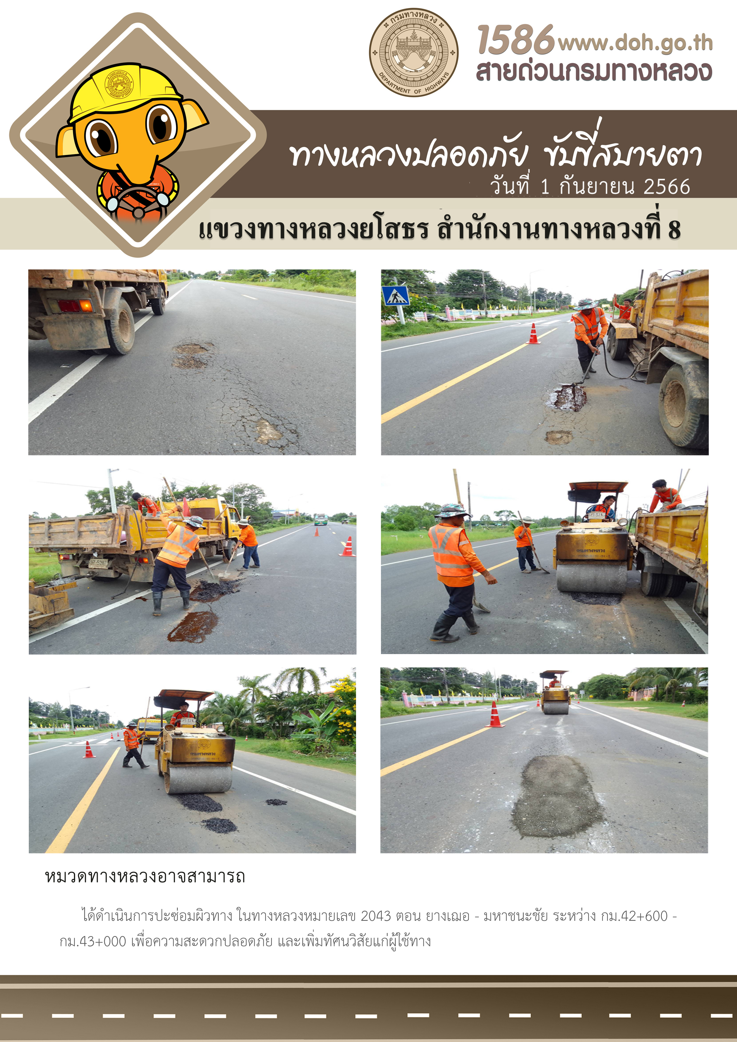 วันที่ 1 กันยายน 2566 หมวดทางหลวงอาจสามารถ ได้ดำเนินการปะซ่อมผิวทาง ในทางหลวงหมายเลข 2043 ตอน ยางเฌอ - มหาชนะชัย ระหว่าง กม.42+600 - กม.43+000 เพื่อความสะดวกปลอดภัย และเพิ่มทัศนวิสัยแก่ผู้ใช้ทาง