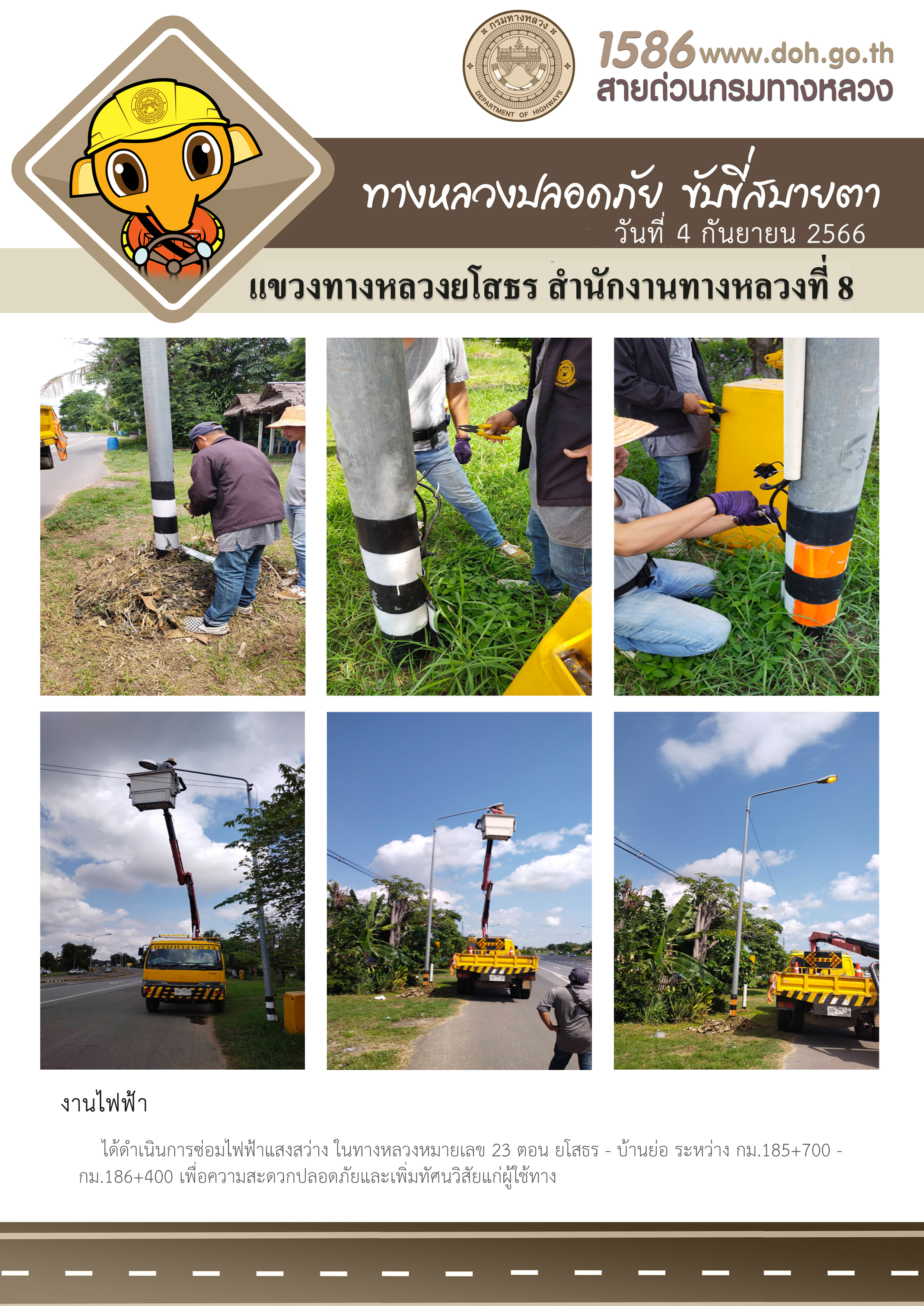 วันที่ 4 กันยายน 2566 งานไฟฟ้า ได้ดำเนินการซ่อมไฟฟ้าแสงสว่าง ในทางหลวงหมายเลข 23 ตอน ยโสธร - บ้านย่อ ระหว่าง กม.185+700 - กม.186+400 เพื่อความสะดวกปลอดภัยและเพิ่มทัศนวิสัยแก่ผู้ใช้ทาง