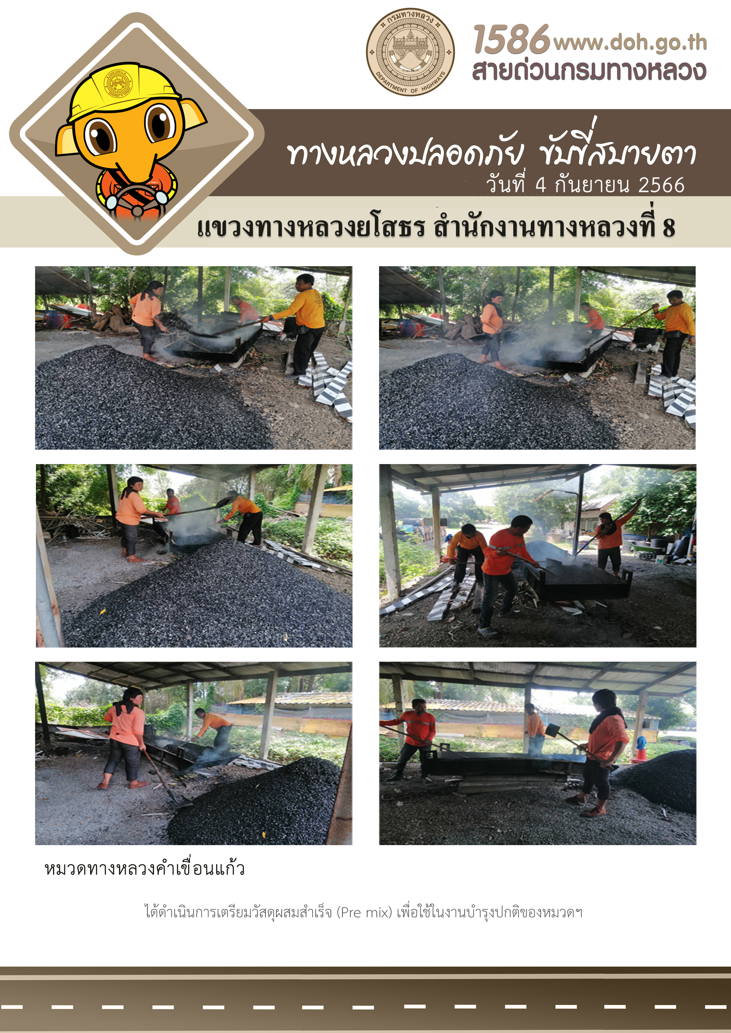 วันที่ 4 กันยายน 2566 หมวดทางหลวงคำเขื่อนแก้ว ได้ดำเนินการเตรียมวัสดุผสมสำเร็จ (Pre mix) เพื่อใช้ในงานบำรุงปกติของหมวดฯ