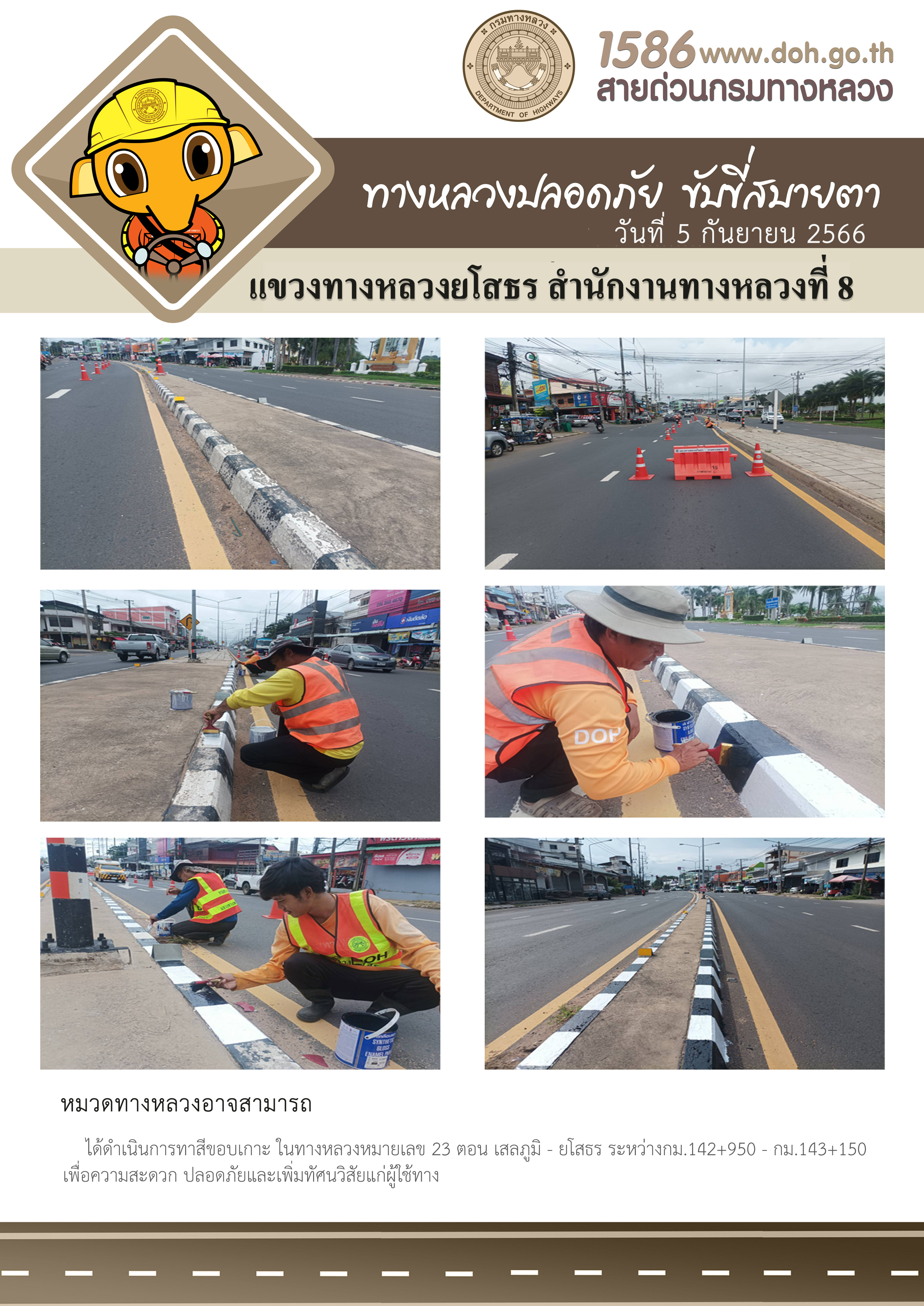 วันที่ 5 กันยายน 2566 หมวดทางหลวงอาจสามารถ ได้ดำเนินการทาสีขอบเกาะ ในทางหลวงหมายเลข 23 ตอน เสลภูมิ - ยโสธร ระหว่าง กม.142+950 - กม.143+150 เพื่อความสะดวก ปลอดภัยและเพิ่มทัศนวิสัยแก่ผู้ใช้ทาง
