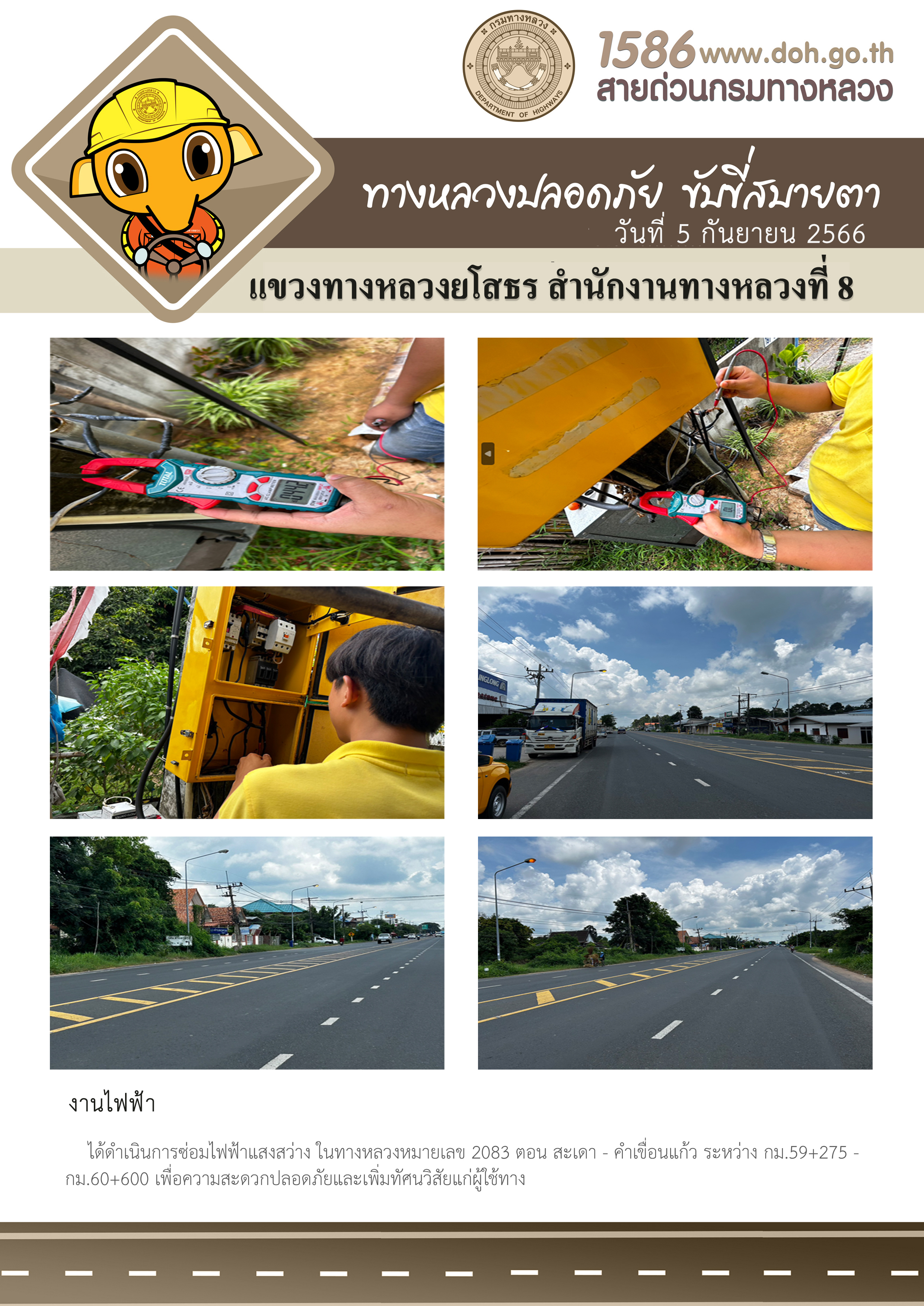 วันที่ 5 กันยายน 2566 งานไฟฟ้า ได้ดำเนินการซ่อมไฟฟ้าแสงสว่าง ในทางหลวงหมายเลข 2083 ตอน สะเดา - คำเขื่อนแก้ว ระหว่าง กม.59+275 - กม.60+600 เพื่อความสะดวกปลอดภัยและเพิ่มทัศนวิสัยแก่ผู้ใช้ทาง