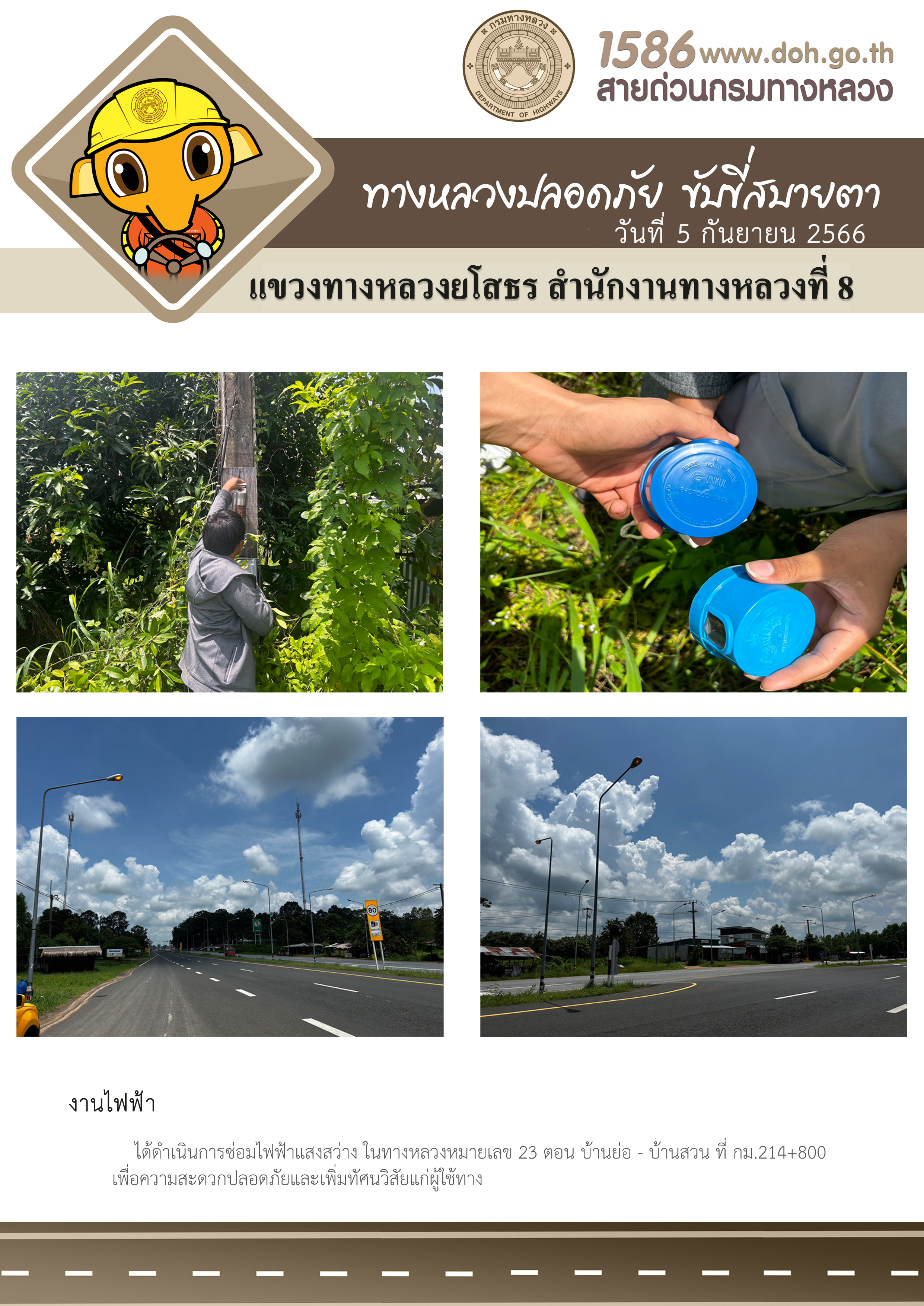 วันที่ 5 กันยายน 2566 งานไฟฟ้า ได้ดำเนินการซ่อมไฟฟ้าแสงสว่าง ในทางหลวงหมายเลข 23 ตอน บ้านย่อ - บ้านสวน ที่ กม.214+800 เพื่อความสะดวกปลอดภัยและเพิ่มทัศนวิสัยแก่ผู้ใช้ทาง
