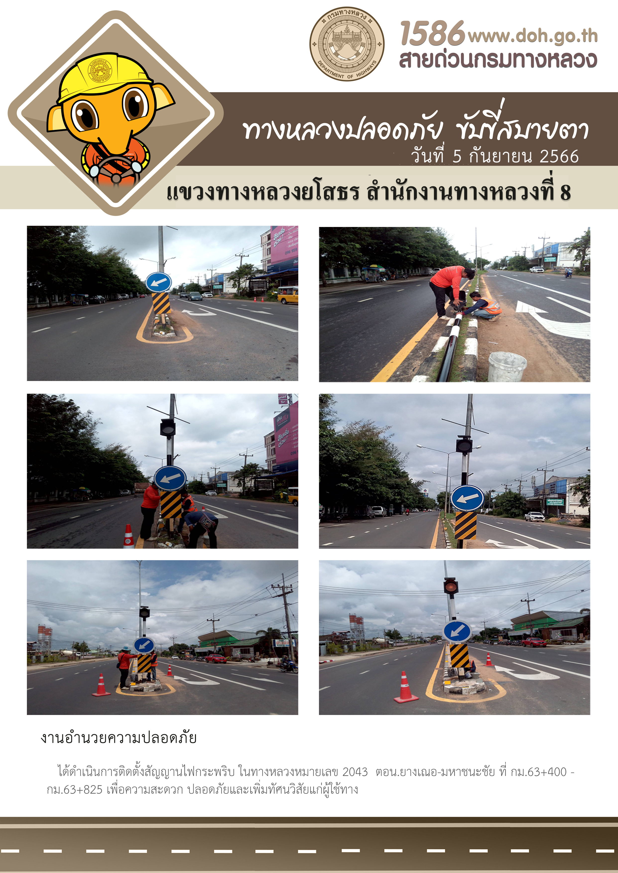 วันที่ 5 กันยายน 2566 งานอำนวยความปลอดภัย ได้ดำเนินการติดตั้งสัญญานไฟกระพริบ ในทางหลวงหมายเลข 2043 ตอน ยางเฌอ - มหาชนะชัย ที่ กม.63+400 - กม.63+825 เพื่อความสะดวก ปลอดภัยและเพิ่มทัศนวิสัยแก่ผู้ใช้ทาง