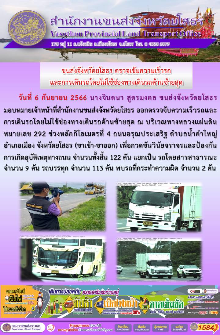 วันที่ 6 กันยายน 2566 เจ้าหน้าที่สำนักงานขนส่งจังหวัดยโสธร ออกตั้งจุดตรวจจับความเร็ว