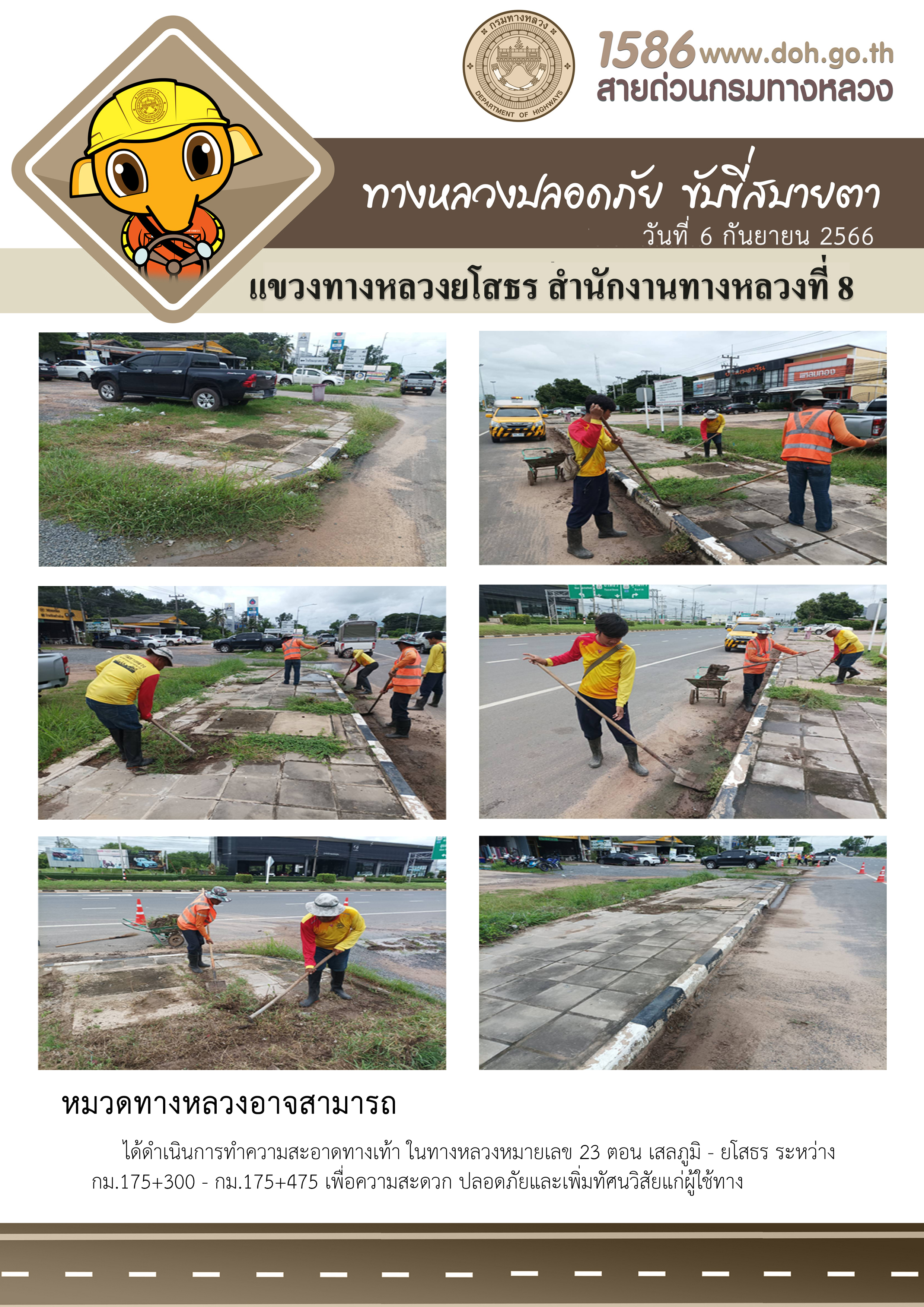 วันที่ 6 กันยายน 2566 หมวดทางหลวงอาจสามารถ ได้ดำเนินการทำความสะอาดทางเท้า ในทางหลวงหมายเลข 23 ตอน เสลภูมิ - ยโสธร ระหว่าง กม.175+300 - กม.175+475 เพื่อความสะดวก ปลอดภัยและเพิ่มทัศนวิสัยแก่ผู้ใช้ทาง