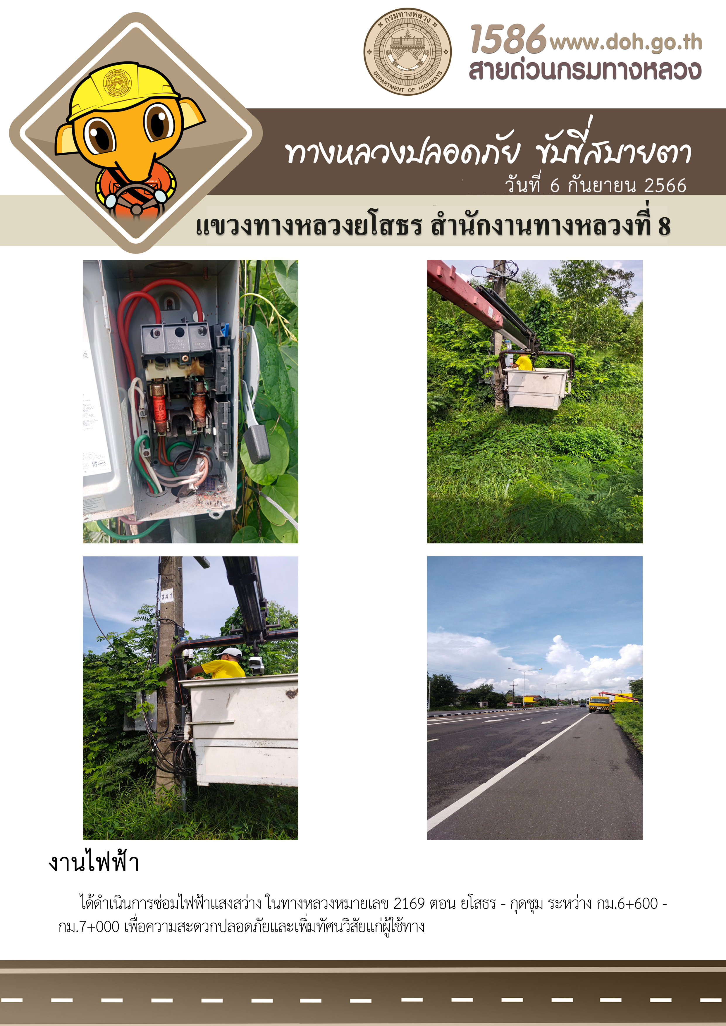 วันที่ 6 กันยายน 2566 งานไฟฟ้า ได้ดำเนินการซ่อมไฟฟ้าแสงสว่าง ในทางหลวงหมายเลข 2169 ตอน ยโสธร - กุดชุม ระหว่าง กม.6+600 - กม.7+000 เพื่อความสะดวกปลอดภัยและเพิ่มทัศนวิสัยแก่ผู้ใช้ทาง