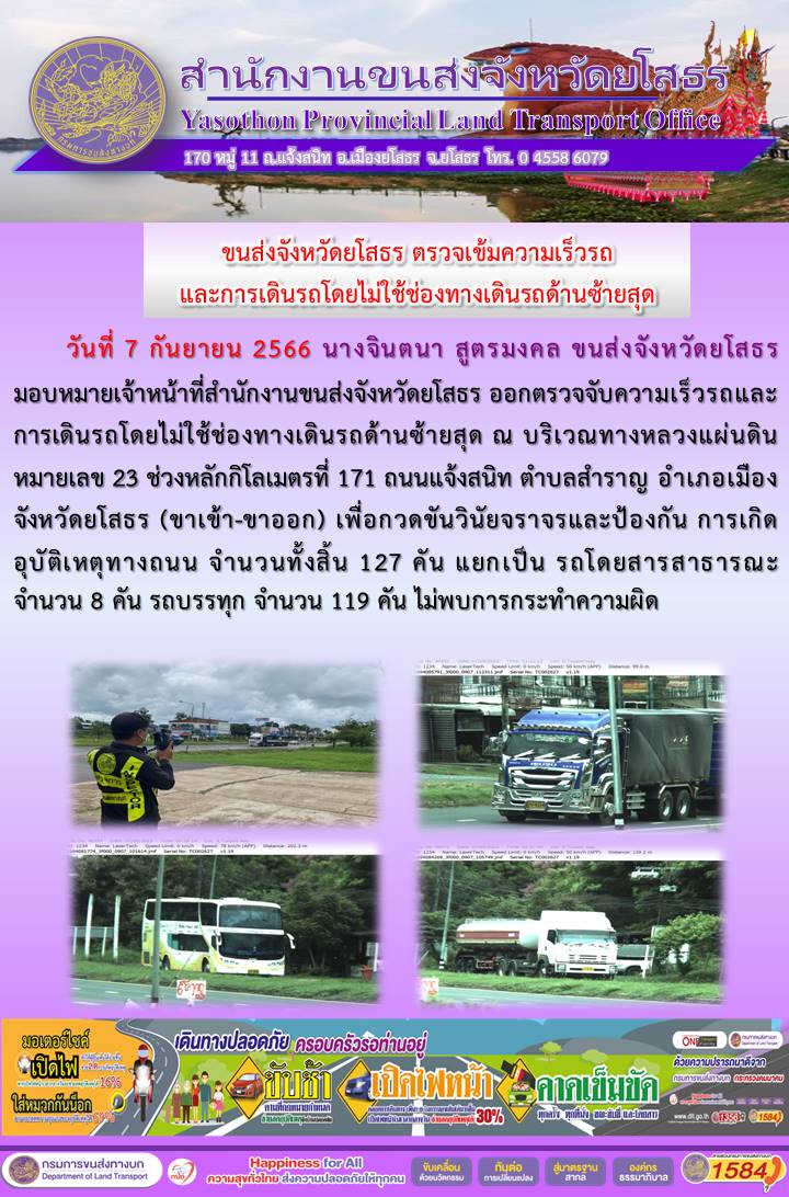 วันที่ 7 กันยายน 2566 เจ้าหน้าที่สำนักงานขนส่งจังหวัดยโสธร ออกตั้งจุดตรวจจับความเร็ว