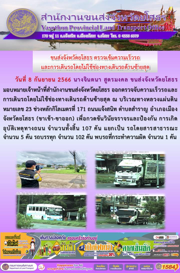 วันที่ 8 กันยายน 2566 เจ้าหน้าที่สำนักงานขนส่งจังหวัดยโสธร ออกตั้งจุดตรวจจับความเร็ว