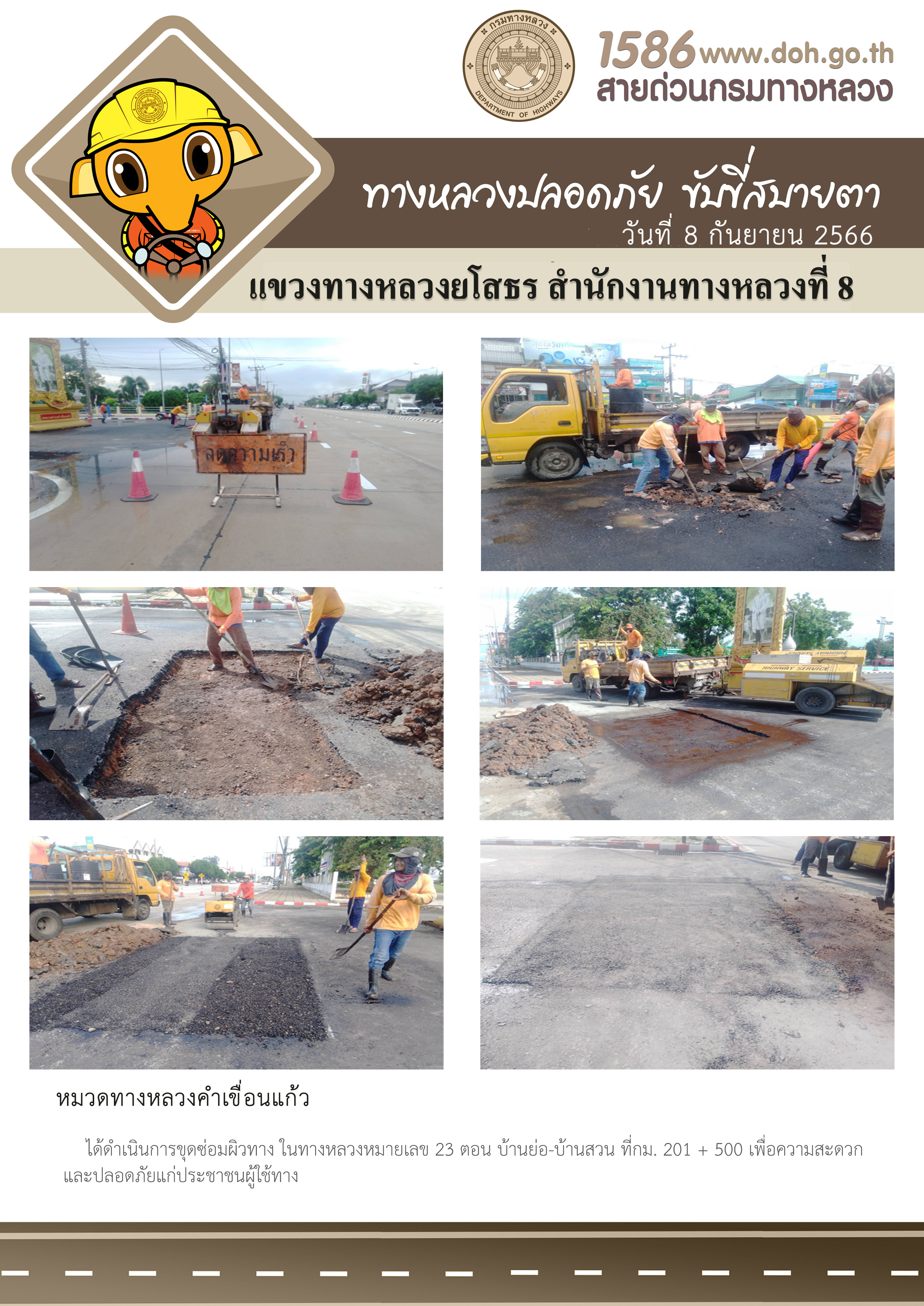 วันที่ 8 กันยายน 2566 หมวดทางหลวงคำเขื่อนแก้ว ได้ดำเนินการขุดซ่อมผิวทาง ในทางหลวงหมายเลข 23 ตอน บ้านย่อ-บ้านสวน ที่ กม.201+500 เพื่อความสะดวก และปลอดภัยแก่ประชาชนผู้ใช้ทาง
