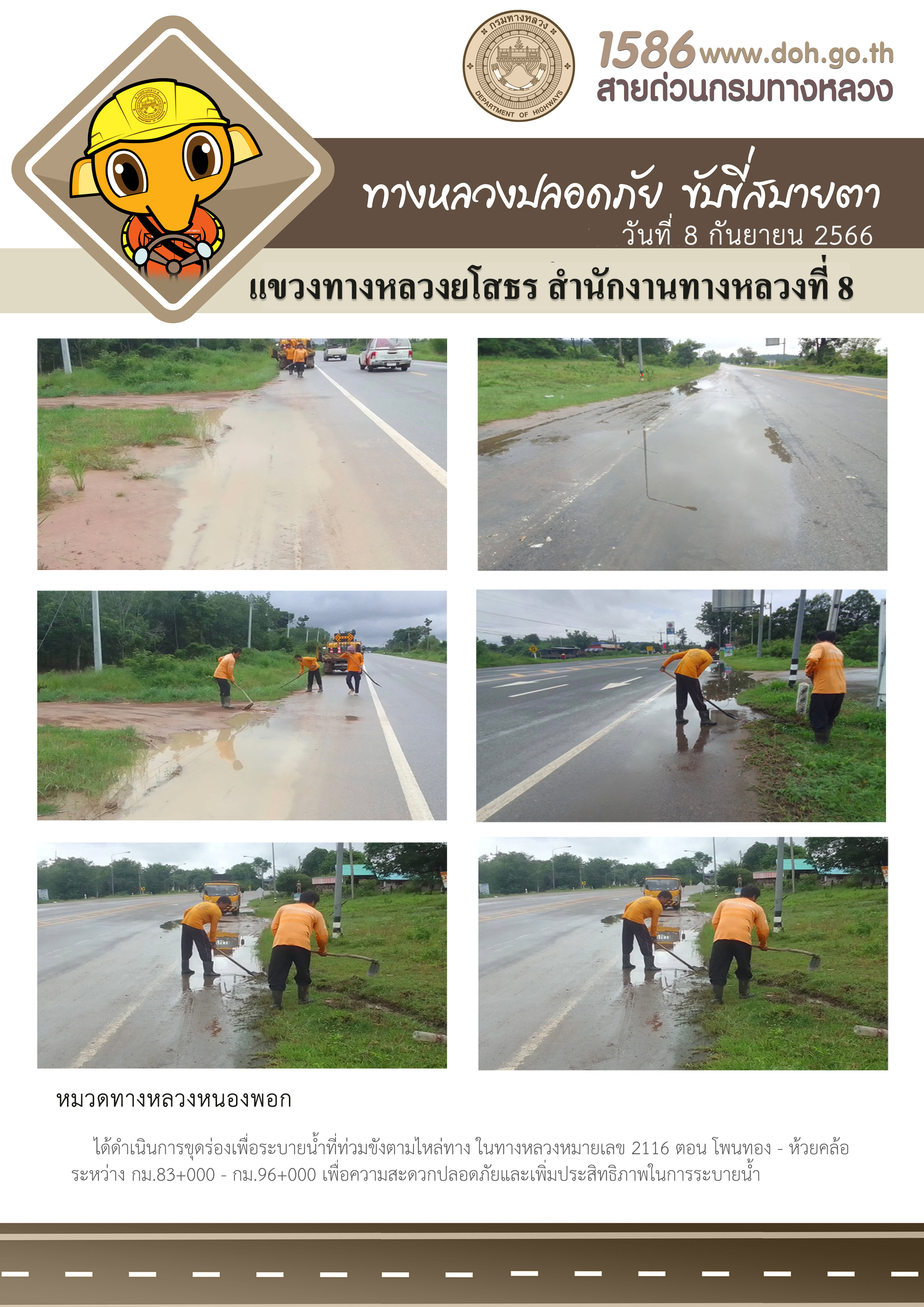 วันที่ 8 กันยายน 2566 หมวดทางหลวงหนองพอก ได้ดำเนินการขุดร่องเพื่อระบายน้ำที่ท่วมขังตามไหล่ทาง ในทางหลวงหมายเลข 2116 ตอน โพนทอง - ห้วยคล้อ ระหว่าง กม.83+000 - กม.96+000 เพื่อความสะดวกปลอดภัยและเพิ่มประสิทธิภาพในการระบายน้ำ