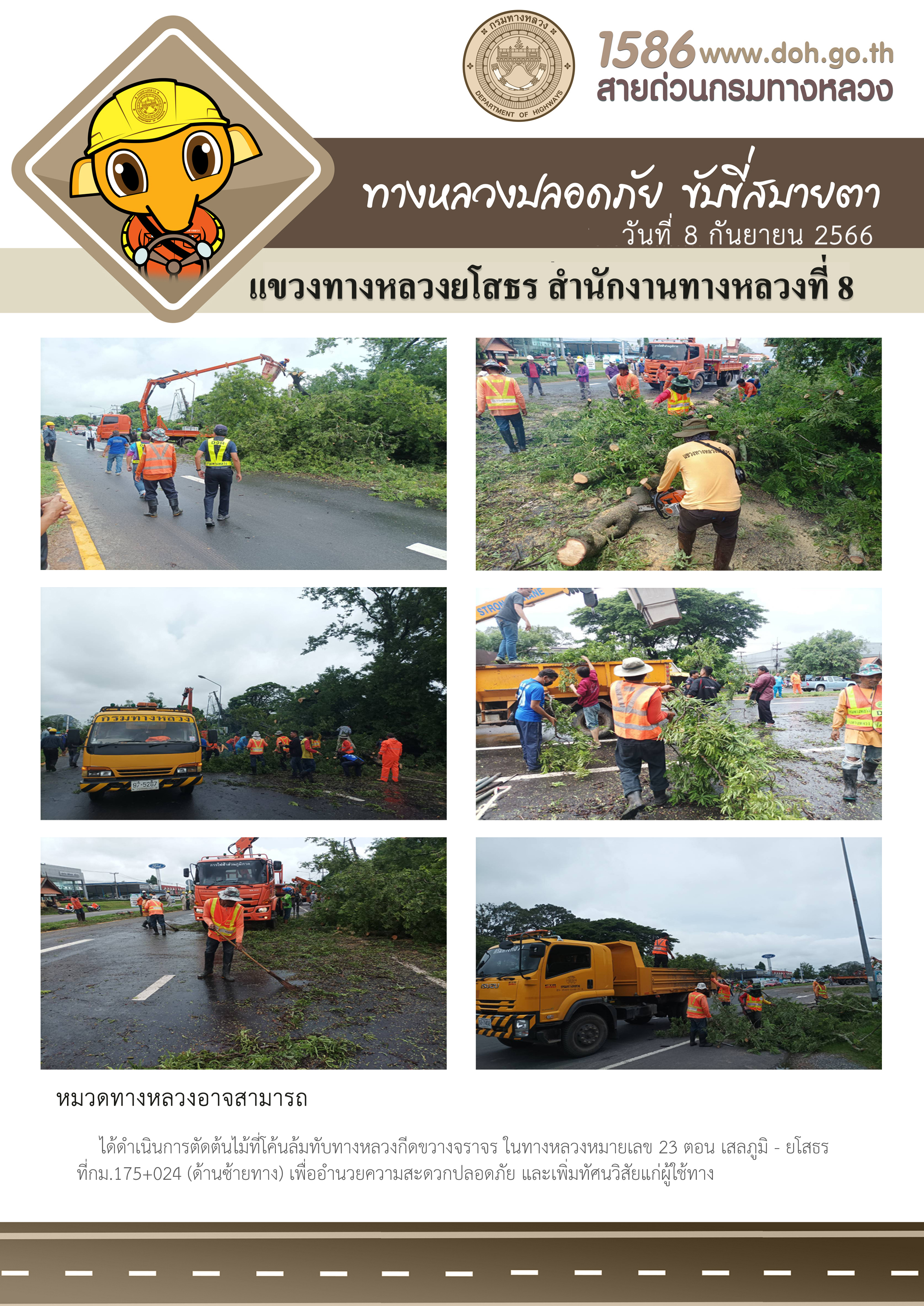 วันที่ 8 กันยายน 2566 หมวดทางหลวงอาจสามารถ ได้ดำเนินการตัดต้นไม้ที่โค่นล้มทับทางหลวงกีดขวางจราจร ในทางหลวงหมายเลข 23 ตอน เสลภูมิ - ยโสธร ที่ กม.175+024 (ด้านซ้ายทาง) เพื่ออำนวยความสะดวกปลอดภัย และเพิ่มทัศนวิสัยแก่ผู้ใช้ทาง