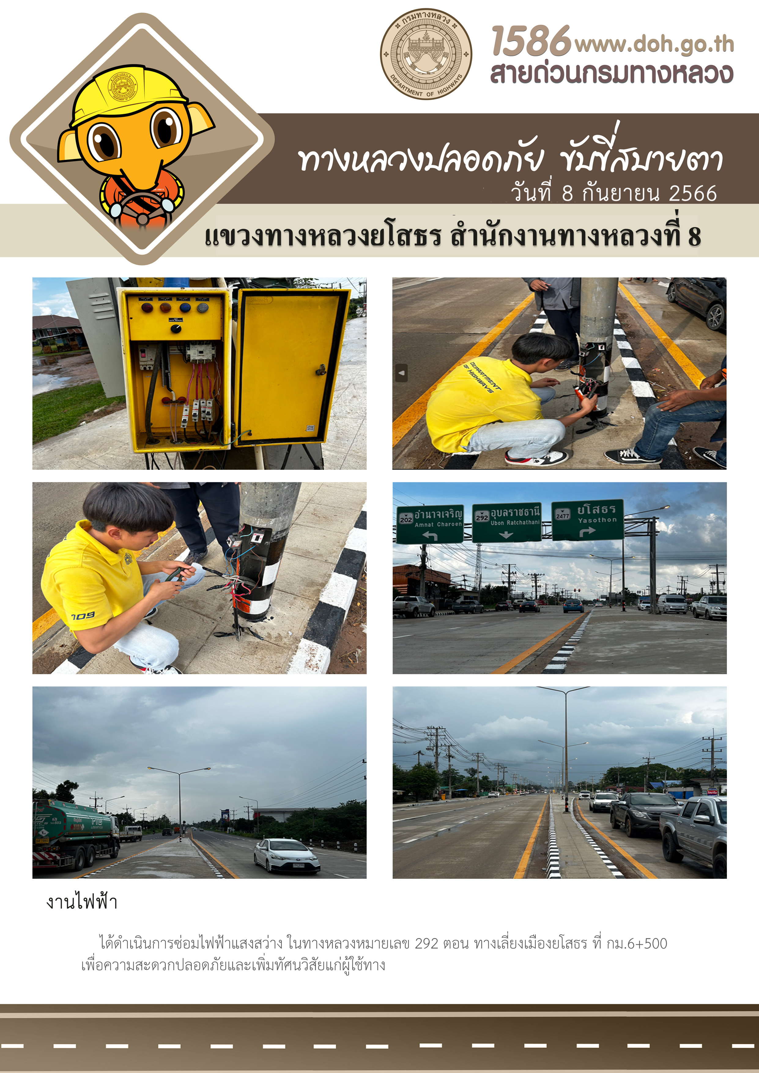 วันที่ 8 กันยายน 2566 งานไฟฟ้า ได้ดำเนินการซ่อมไฟฟ้าแสงสว่าง ในทางหลวงหมายเลข 292 ตอน ทางเลี่ยงเมืองยโสธร ที่ กม.6+500 เพื่อความสะดวกปลอดภัยและเพิ่มทัศนวิสัยแก่ผู้ใช้ทาง
