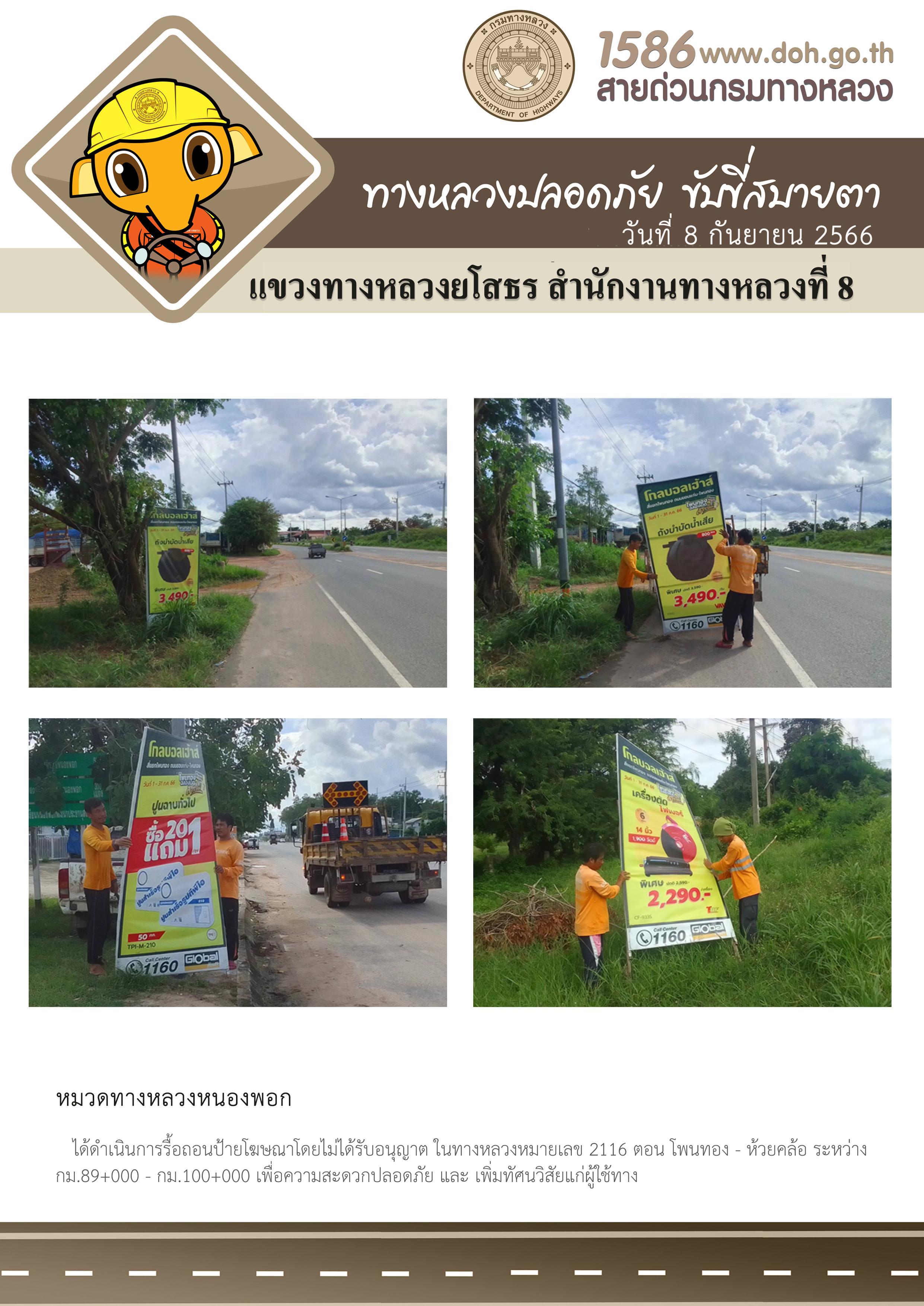 วันที่ 8 กันยายน 2566 หมวดทางหลวงหนองพอก ได้ดำเนินการรื้อถอนป้ายโฆษณาโดยไม่ได้รับอนุญาต ในทางหลวงหมายเลข 2116 ตอน โพนทอง - ห้วยคล้อ ระหว่าง กม.89+000 - กม.100+000 เพื่อความสะดวกปลอดภัย และเพิ่มทัศนวิสัยแก่ผู้ใช้ทาง
