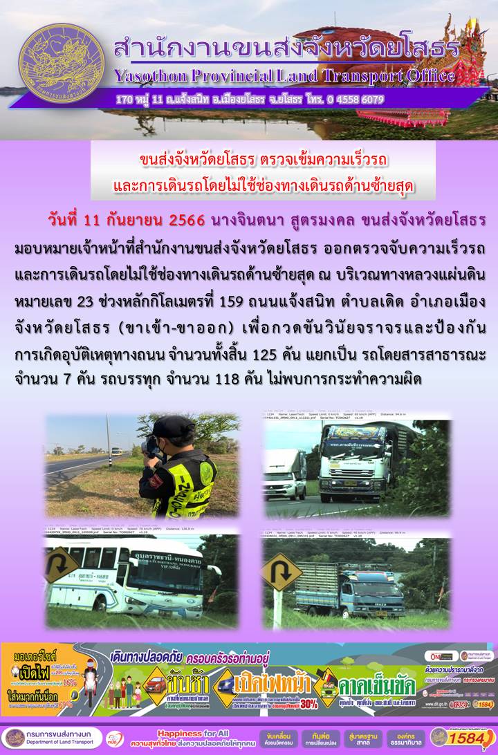 วันที่ 11 กันยายน 2566 เจ้าหน้าที่สำนักงานขนส่งจังหวัดยโสธร ออกตั้งจุดตรวจจับความเร็ว